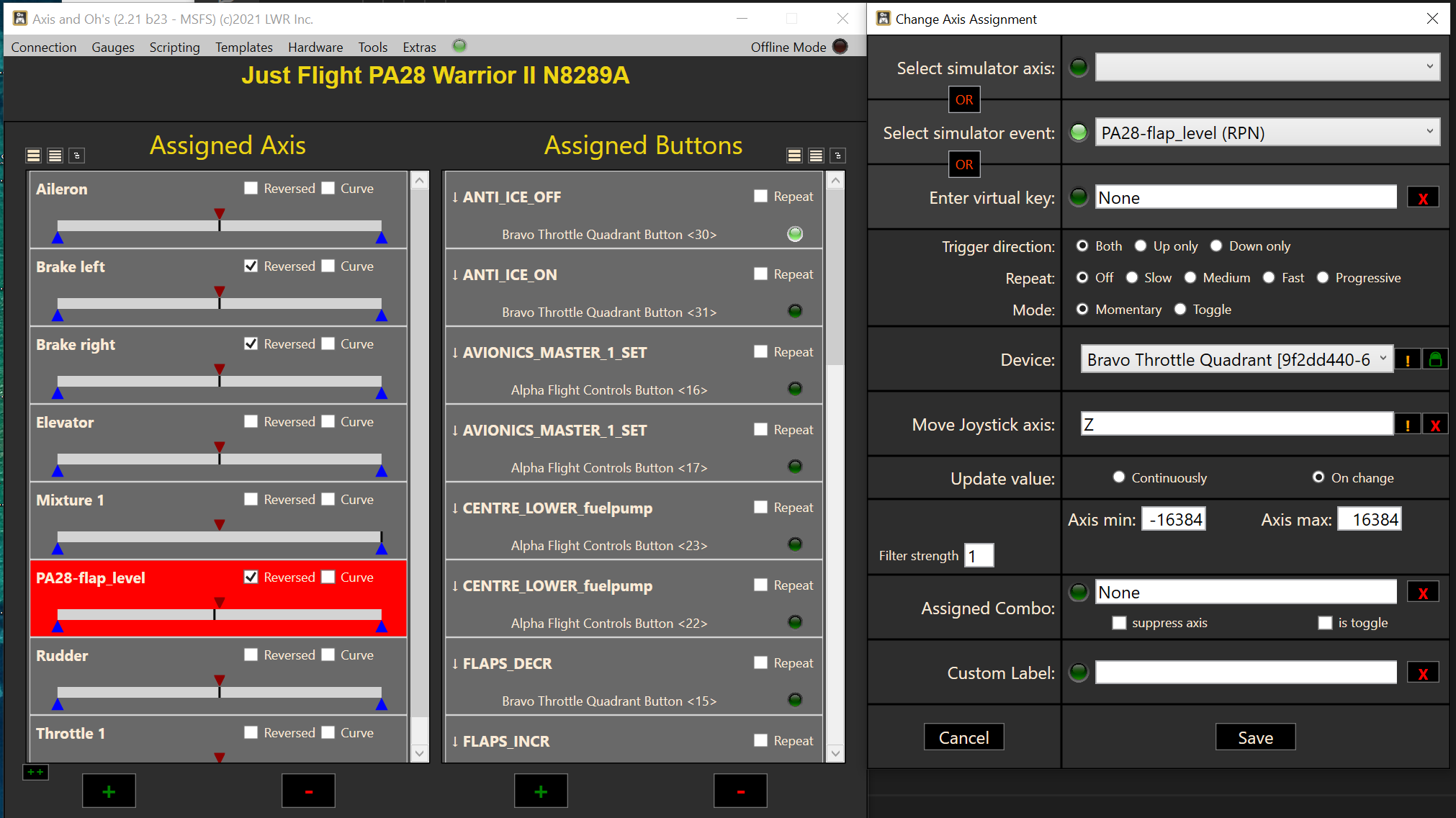 I am new user building scripts with 2.21.b23. I have assigned a script to a Bravo axis with the idea to do flap lever per some of the earlier examples (CRJ700). But my script is not being called when the axis changes. I compared the xml to other sample templates but do not see my mistake. Group and script name are correct but the script is not entered when the axis is moved. I also tried continuous.