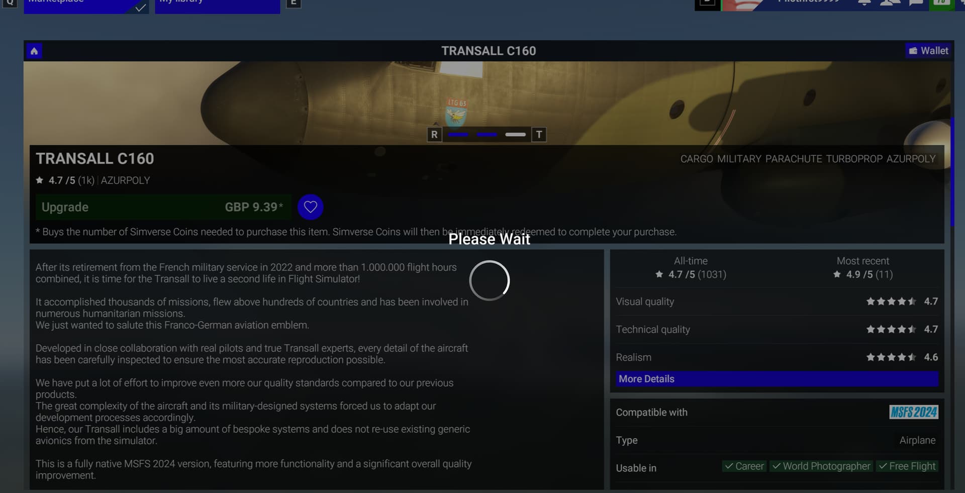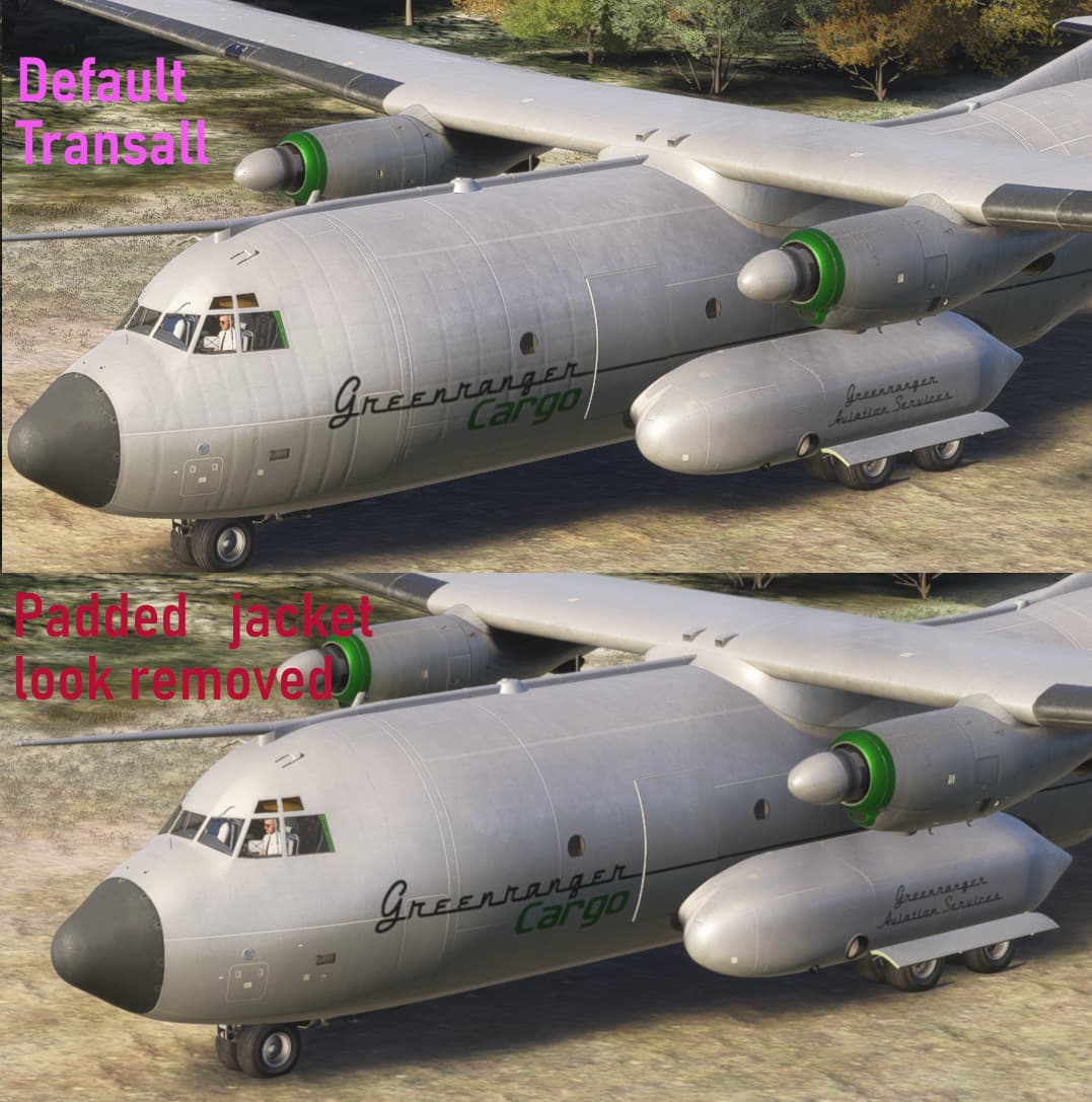 Really not liking the padded jacket effect on the 2024 update for the Transall. While this effect exists on real aircraft it is usually barely visible. And then only in very low light conditions. This seems to only be a problem with the 2024 update, as the 2020 version of the Transall doesn’t have this problem. Livery designers can reduce or remove this effect, but it’s a fair amount of work. Milviz did the same thing with the Dirty 30 C130 for 2024, and then had to remove it after complaints.