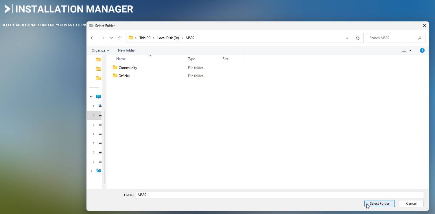 Select the folder you created earlier for example: D:\MSFS