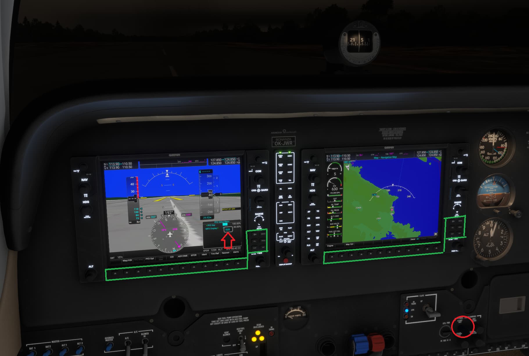 By turning knob in red circle (“FLIGHT INST”), only buttons in green are dimmed, rest of G1000 buttons shine like as star, unable to dim them even throug G1000 brightness controll, because there is no manual setting - possible bug and the G1000 button should be dimmed by the missing option???