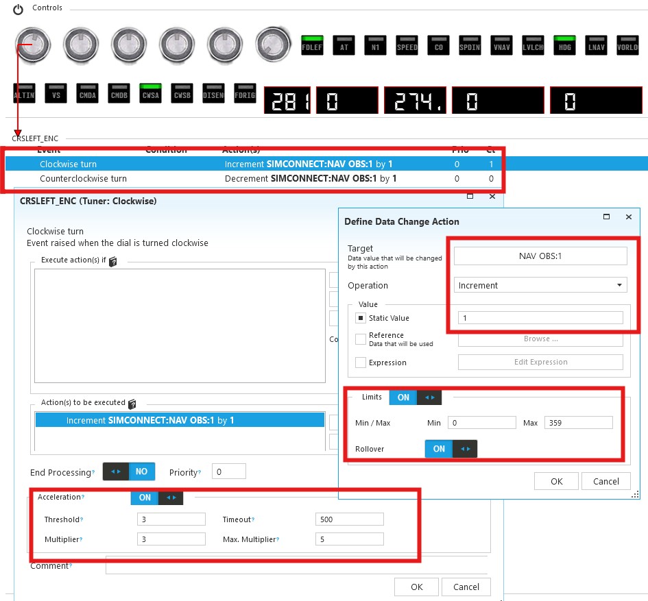 To manage VOR OBS or HDG course, best way is still to use CW/CCW events with 1° inc or dec steps of the targeted var. You can even setup acceleration values within SPADâŠ