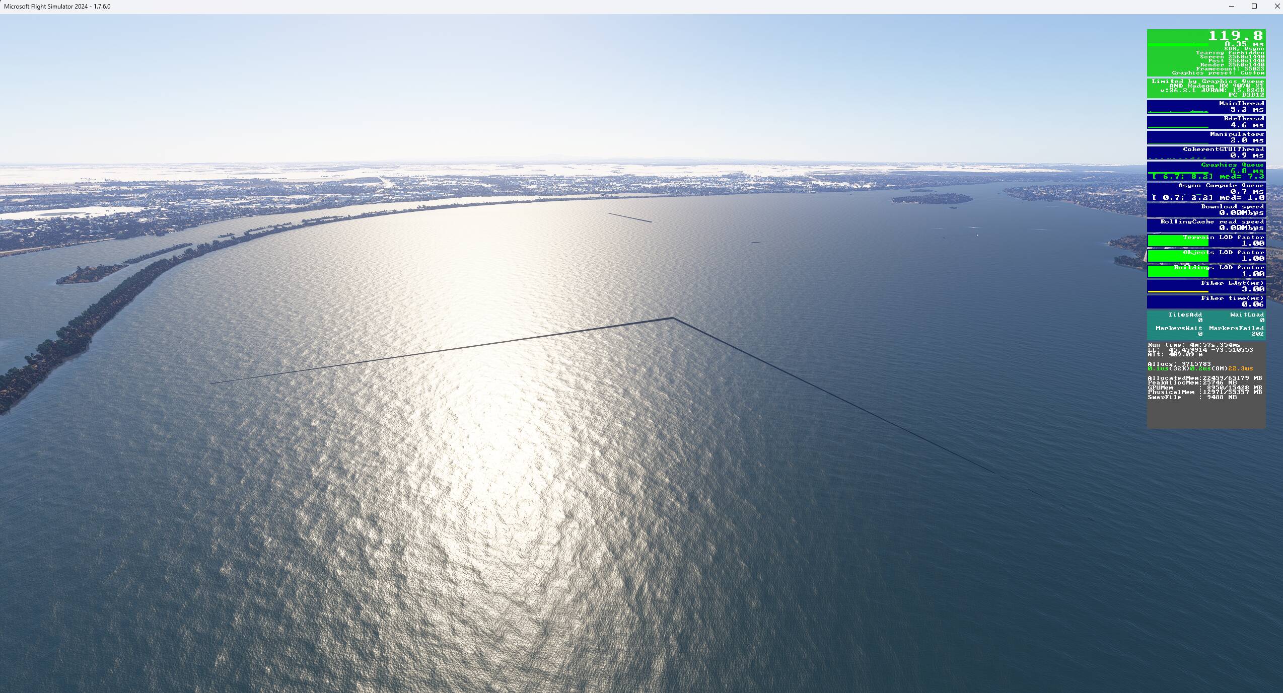 I often fly close to the coast or over sea water, because one of the things I often do is Helo transportation on oil rigs. Just recently I came back to FS24 after a few month hiatus. I would have noticed these lines back then, since I’m very picky when it comes to immersion breaking graphics glitches.