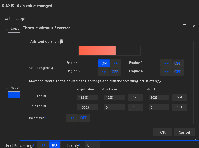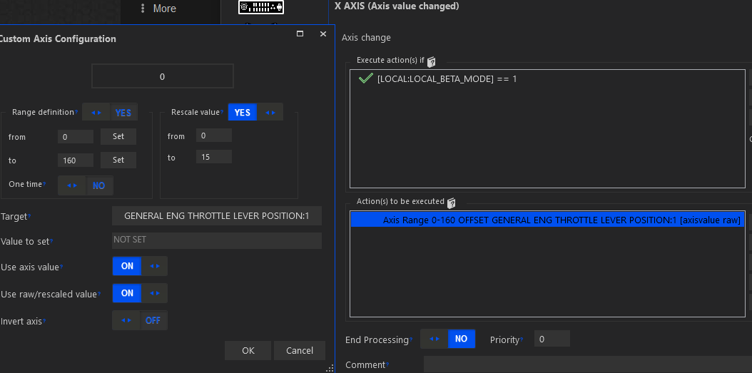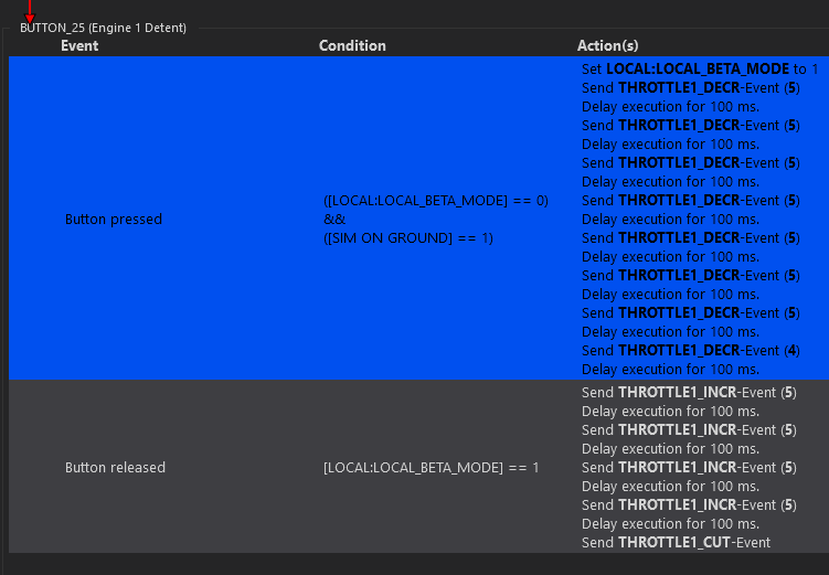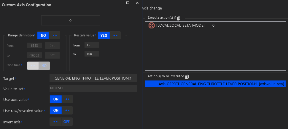 Another option would be to create some local variable for Beta and trigger it manually. When it’s enabled the throttle axis will only register throttle changes from 0 to 15% (i.e. the beta/taxi range) and when I disable my throttle idle will register as 15% minimum. This should work well from the very start until touchdown, it would allow me to go from 15% to reverse and then re-enable beta mode once I’ve gone out of reverse.