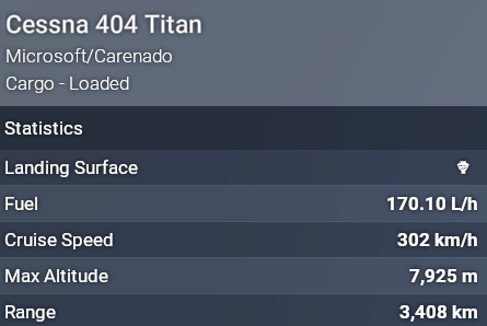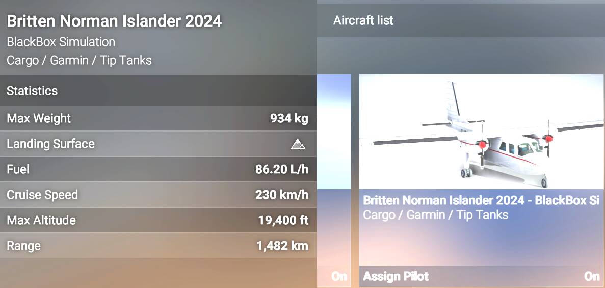 double checking, and here’s the Britten Norman Islander’s stats in my company’s Fleet display: