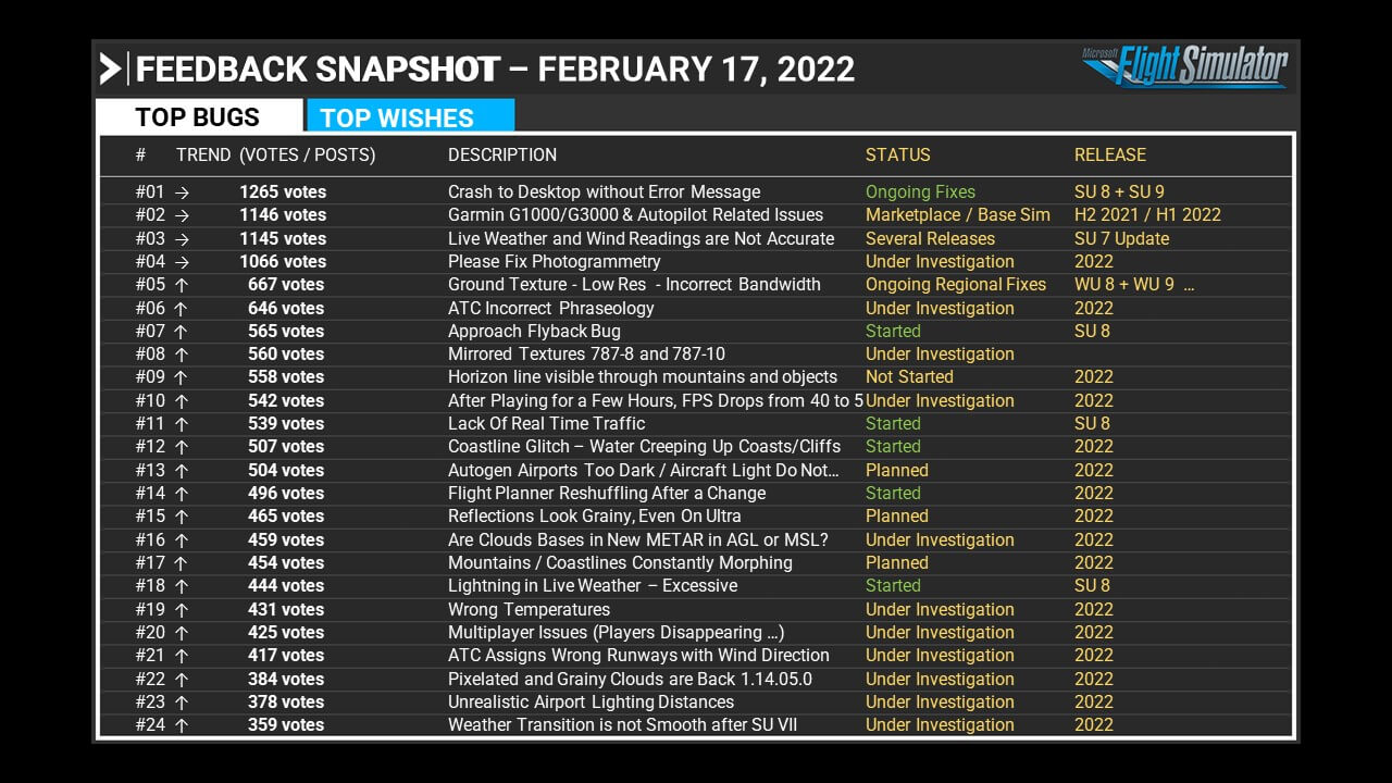 We are working on revamping our Bugs & Issues section to better reflect the top bugs in our Feedback Snapshot. More updates to come!