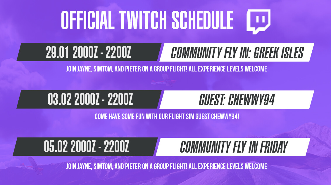 Join us tomorrow for an informal community fly-in over the Greek Isles. More information can be found here. Next Wednesday, Chewwy94 will be taking over the stream, so come say hi! Please refer to our Twitch schedule here for any updates or changes.