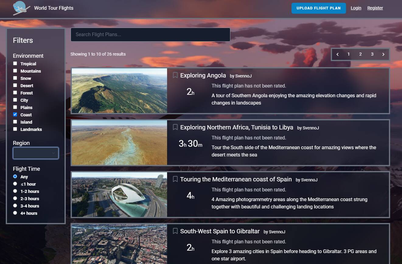 With thousands of airports and millions of square miles to explore in MSFS, Smef wanted a way for any user to look up a flight plan using a robust filter to decide where, how long, and what type of environment you want to fly in to come up with the perfect flight path. Add favorites to your dashboard, view highly rated paths, and more.