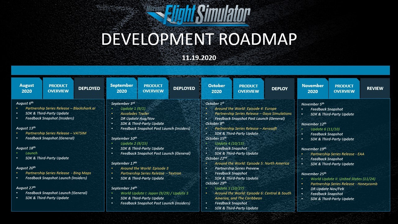 Sim Updates are core updates that will be coming to Microsoft Flight Simulator. There will be a major Sim Update every two to three months. Stay tuned for next week’s Dev Update for a rough schedule of our future releases now through February. Click here for the web-friendly version.