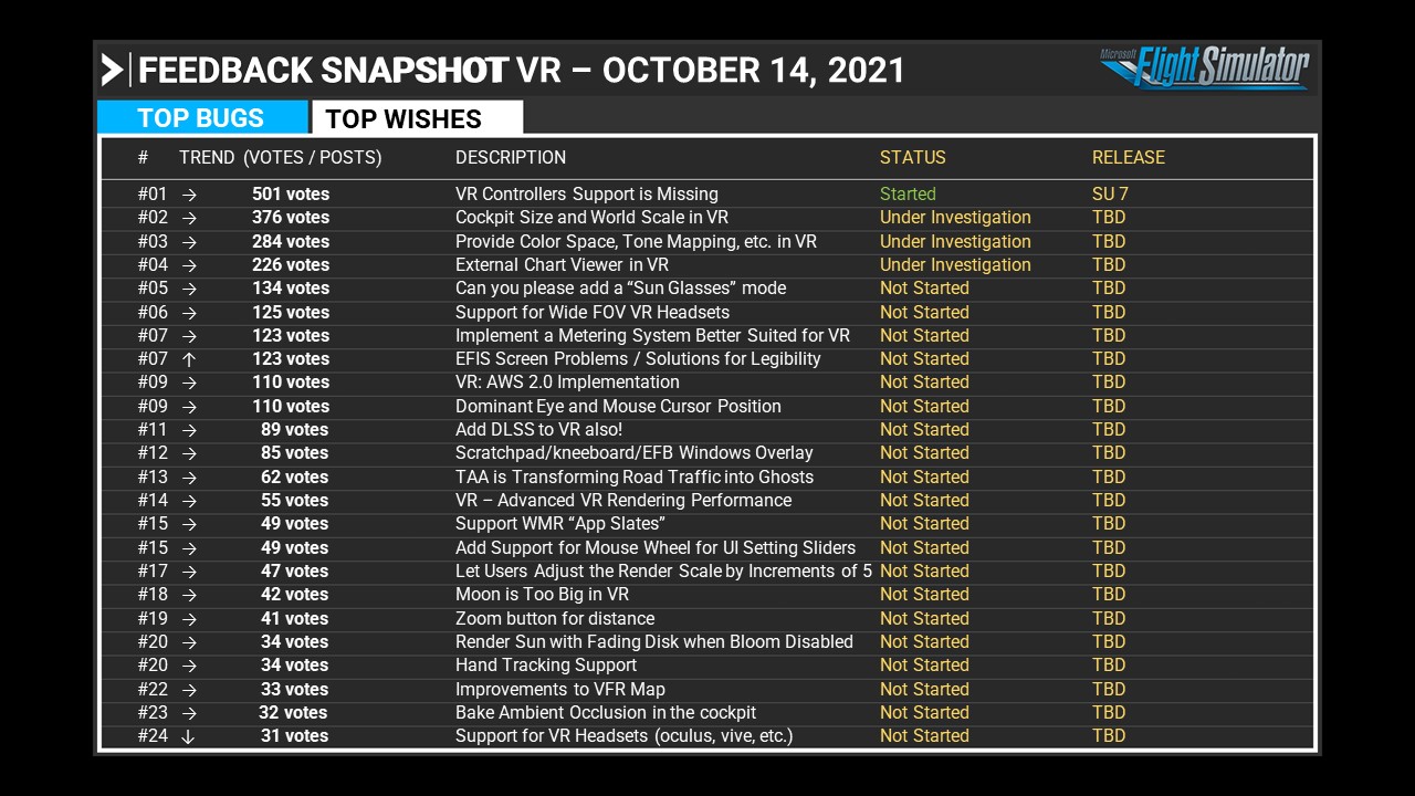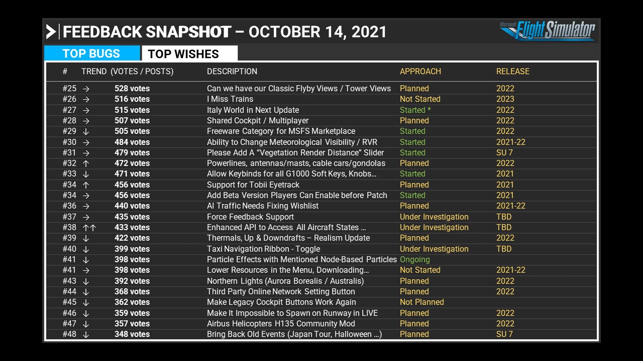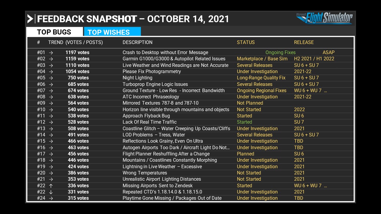 The following bugs will be fixed in Sim Update 6 (Oct. 19th) based on direct Community Feedback from the forums: