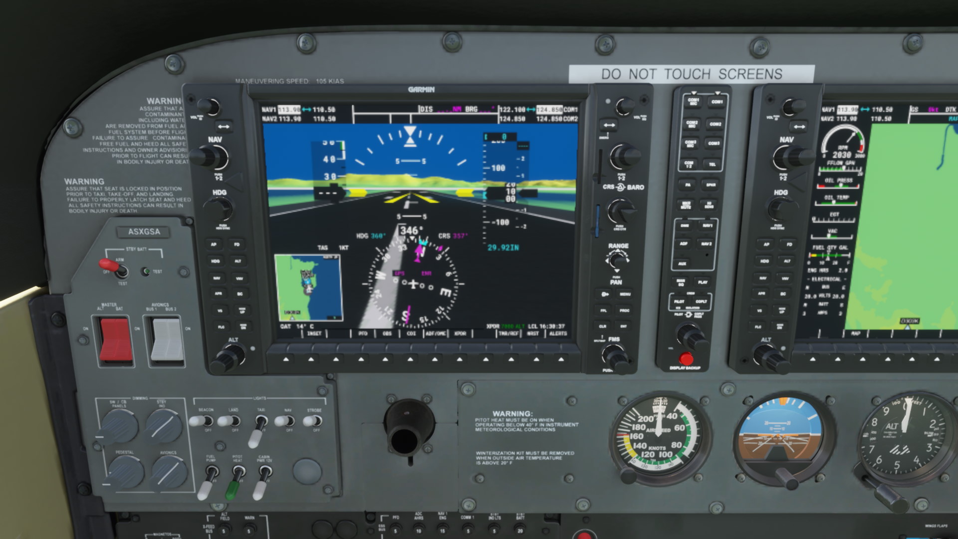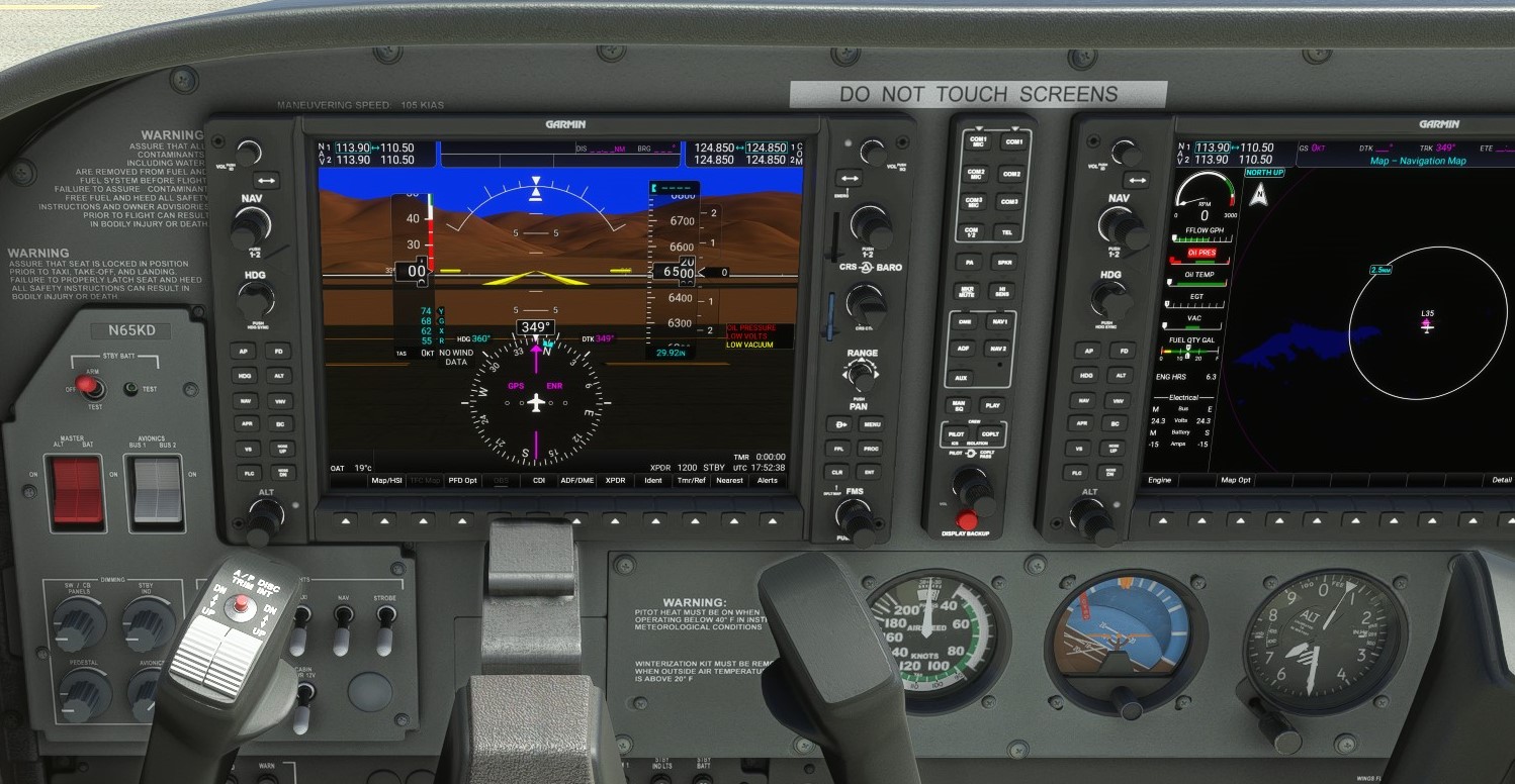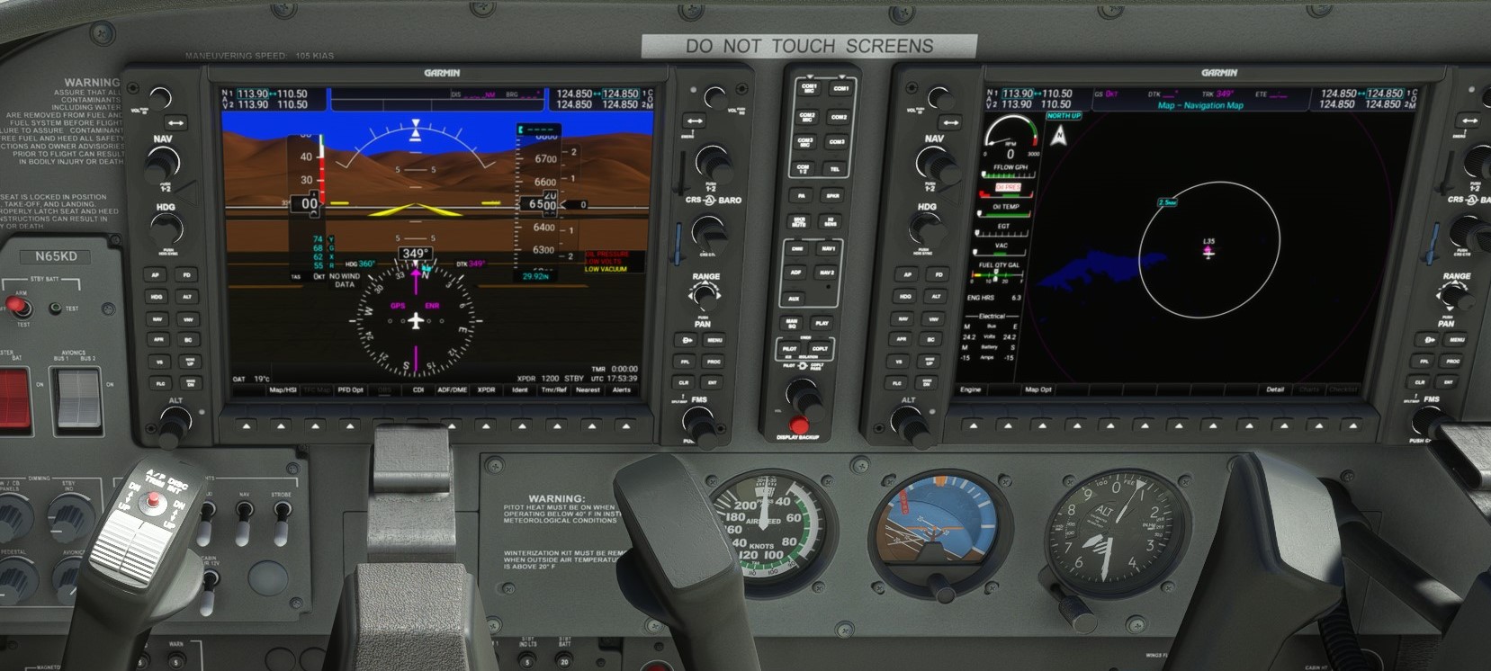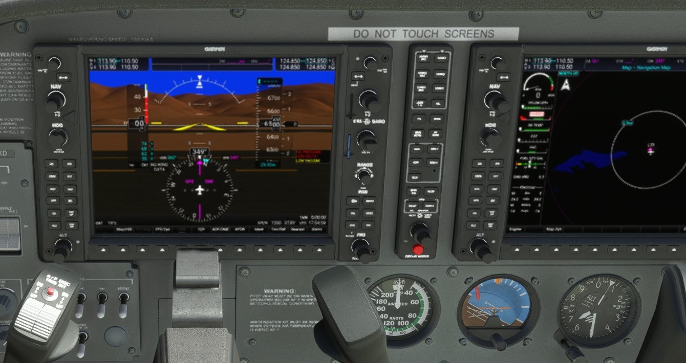 Note how the G1000 screens degrade badly from each version to the next, but the ASI and altimeter don’t. However note also that the button labels and placard text, all of which are static flat textures, are also blurry.