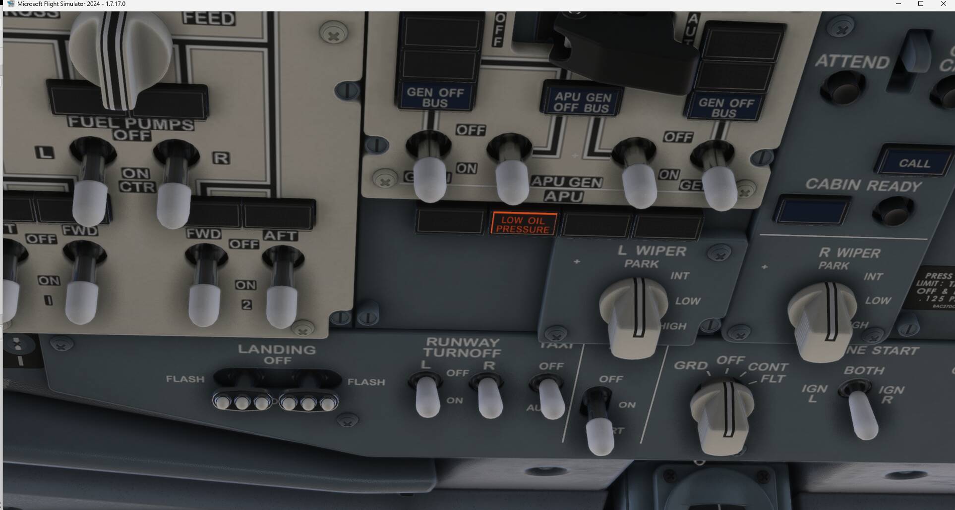 When turning Apu to ON, cannot see starting state, but when blue light APU GEN BUS is ON, then APU GEN swithches are pushed ON, this cuts all electrical in cabin to OFF.