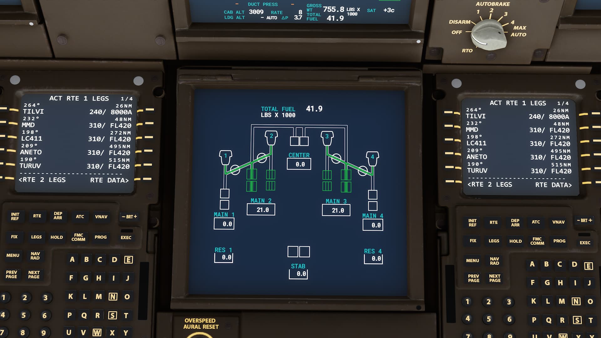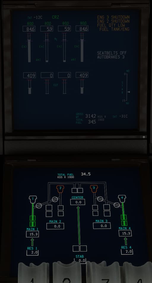 An even bigger problem: As soon as the fuel depletes from Main 2 and 3, engines 2 and 3 lose power respectively. Even with all fuel pumps open, there is no crossfeed from Main 1 to engine 2 and Main 4 to engine 3. The diagram shows that the XFEED valves are open but the fuel doesn’t reach the inner engines. The only way to restart them is to manually put fuel in the inner tanks via the toolbar, and/or use quick stop and quick start shortcuts. The only way to “safely” fly is to load enough fuel into Main 2 and 3 so that they feed engines 2 and 3 during the whole flight, because crossfeed doesn’t work most of the time. Annoyingly enough, it does work sometimes, even though I’m doing everything the same every time.