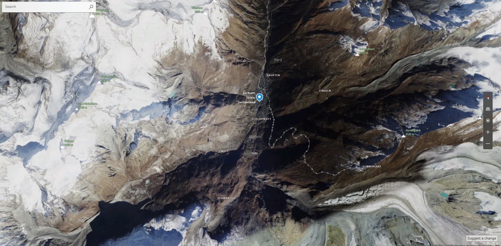 I think I may have an answer for the messed up textures in the Alps and elsewhere. The Bing imagery for Zermatt was taken in the winter as you can see from the picture below, which is reflected in the world map of fs2024. On top of that there is the added problem of the fs2024 permasnow that is impossible to get rid of. That means that it is probably impossible to have summer textures in those areas until Bing puts out some new satellite imagery. There’s still no excuse for the terrible pale textures that are everywhere else though.