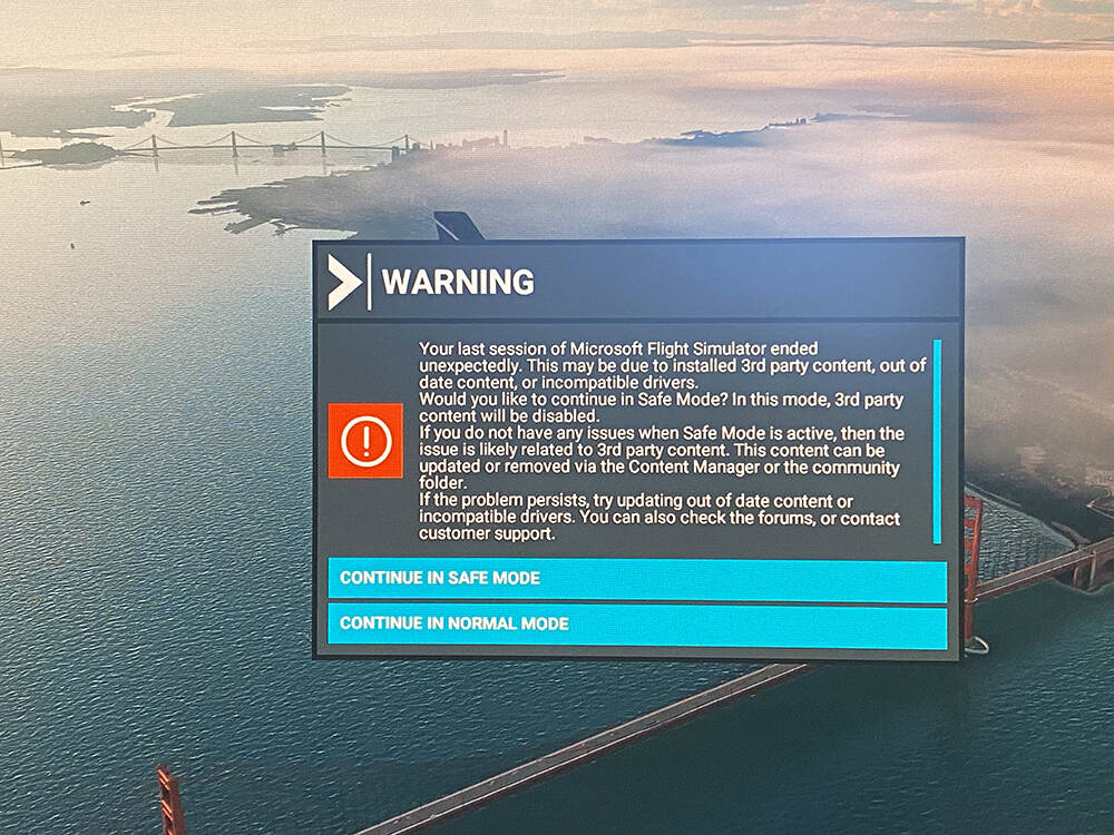 Annoying is, that there is no info what is causing the problem as, for example, X-Plane. If you have hundrets of sceneries it es not possible to find the problem if you have to start and close MSFS hundret times.