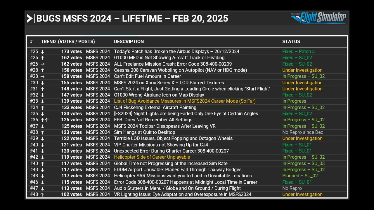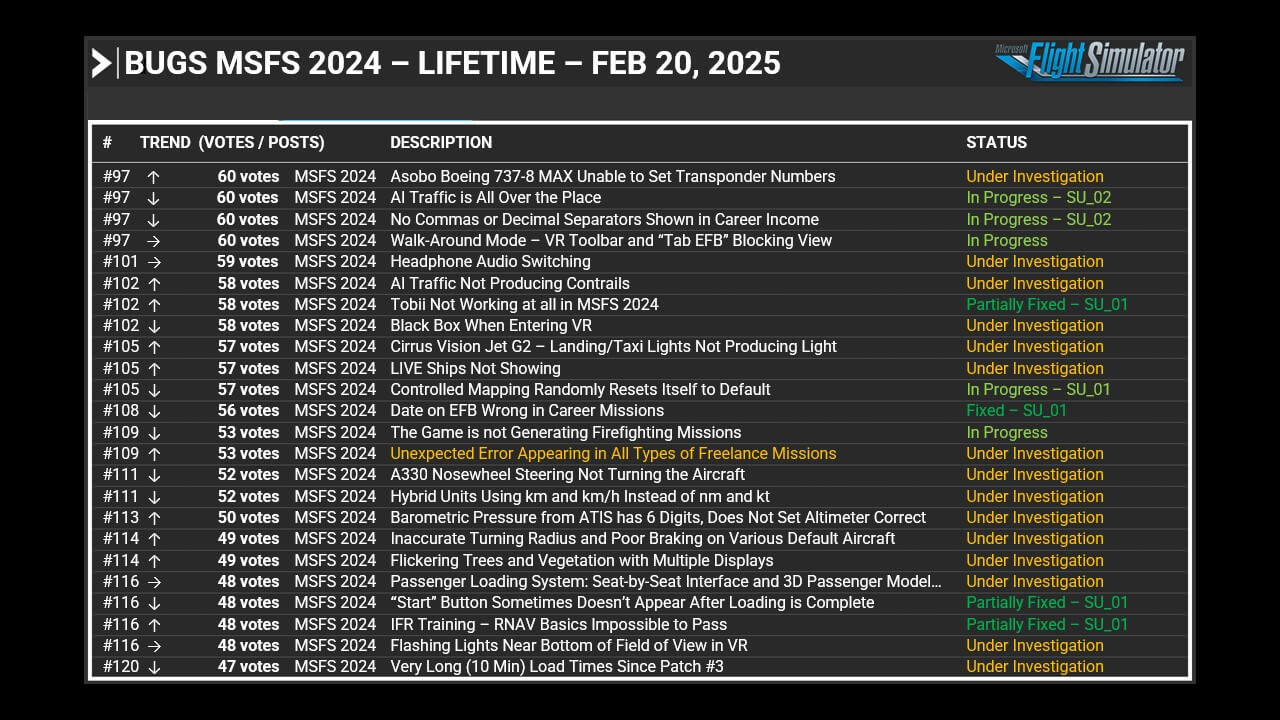 Confirming it doesn’t show up on the MSFS 2024 Feedback Snapshot due to how it is sorted internally - only new bugs are currently being shown at the moment on the Feedback Snapshot. This will be updated later once the focus moves.