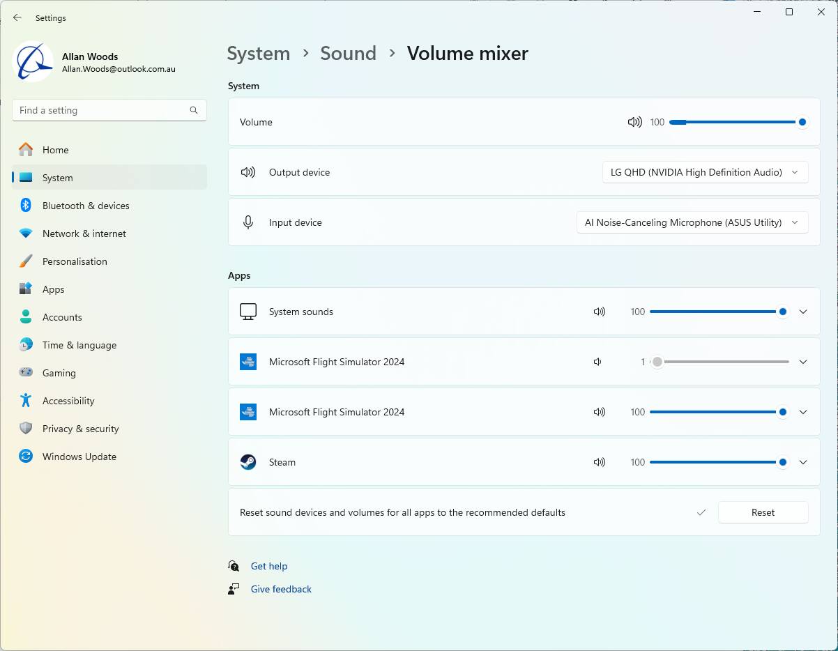 Description of the issue: No audio can be heard for either the cockpit (switches moving etc) or engine. This may be related to the fact that in Windows Settings>System>Sound>Volume mixer, there are multiple instances of MSFS2024 listed as apps. One of them has its audio set to 1/100, and is greyed out/unable to be modifed. In some instances, I’ve seen up to seven MSFS2024s listed as apps in the volume mixer at any one time, with some of them having a volume of 1 and greyed out (screenshot attached).