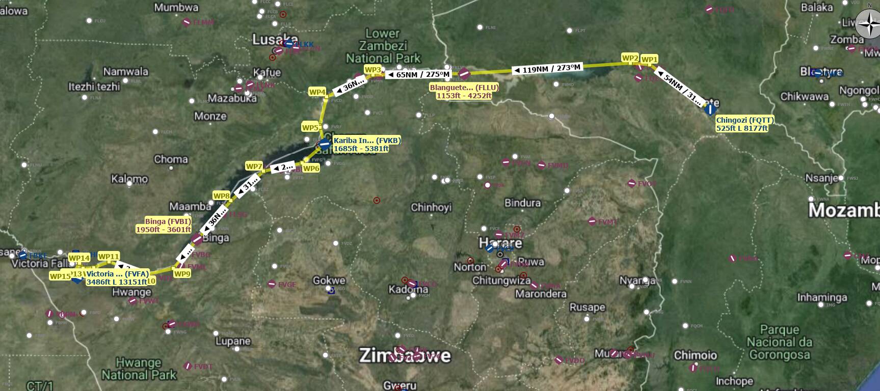 550 NM so we’ll need aircraft that can cruise at 300 knots. One optional off-airport landing on an island in the Zambezi river. Nothing higher than 4,500ft. We’ll follow the river for most of the trip, ending at Victoria Falls. FQTT to FVFA Shortest runway is 4,252 ft.