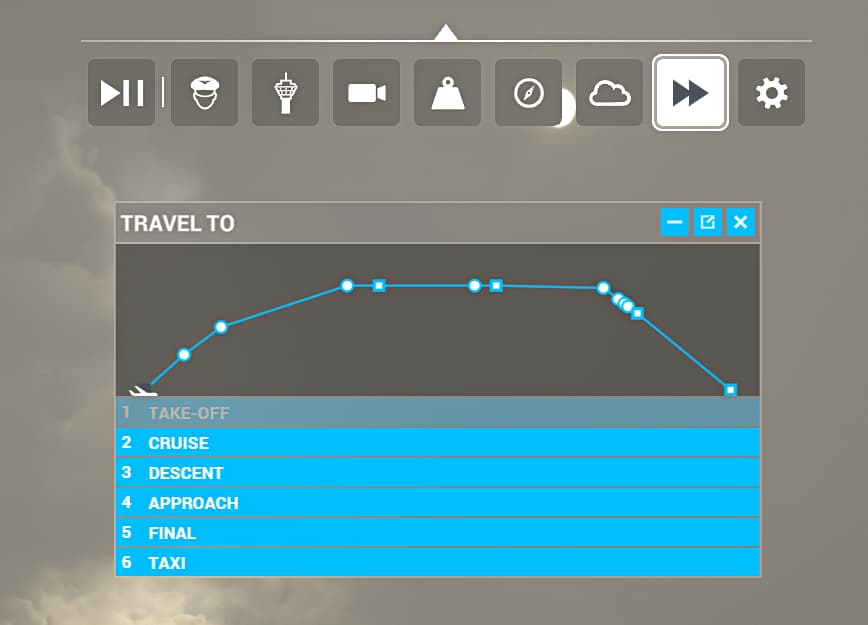 Basically, I want to fly a long-haul IFR flight plan across the globe, but I obviously don’t have 10+ hours to fly in real-time. The “Travel To” feature seems like it would be perfect solution, but even when I highlight individual waypoints, it only allows me to choose from (from memory) Takeoff, Cruise, descent Approach, Final, and Taxi. Well I’ve reached cruising altitude within a few minutes of my flight, but next option, Descent, jumps me ahead like 95% through my flight plan, so I end up missing 90% of my flight.