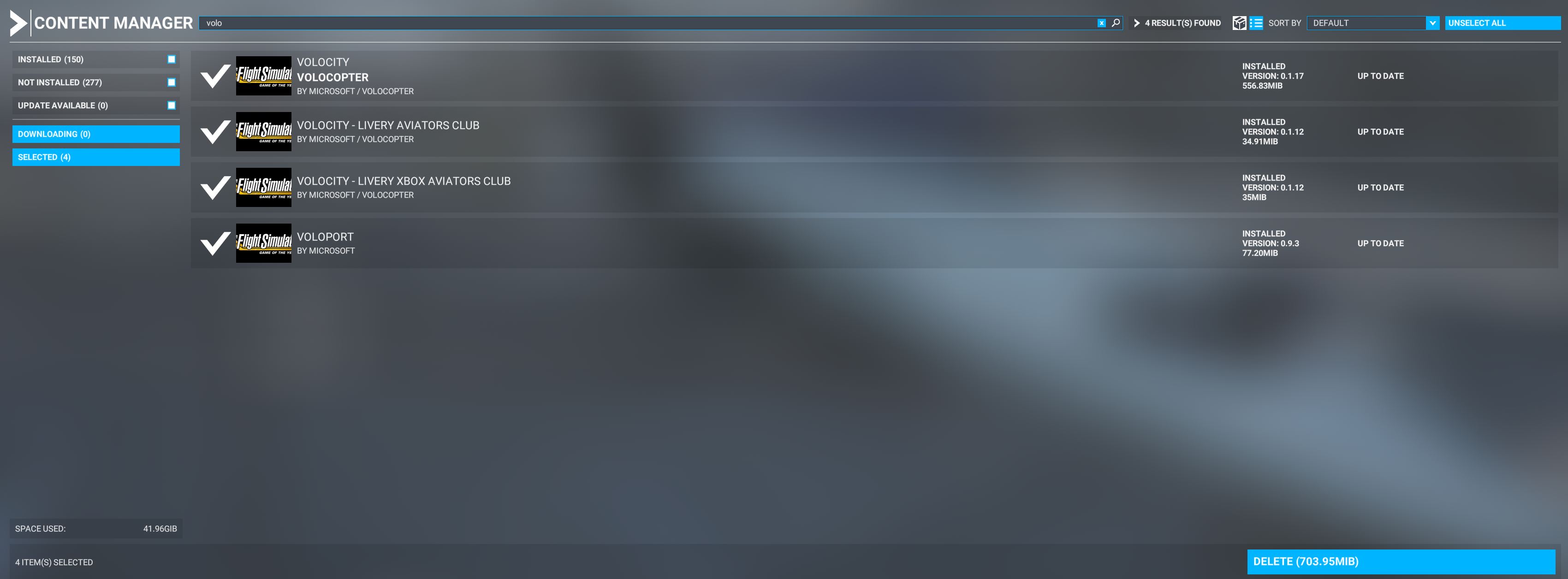 MisterBenson33, thanks for the info but I must be doing something wrong. I have de-installed many aircraft exactly the same way, and it has worked fine. So I go into Content Manager and search for “volo” and find these four entries, and select them for deletion and delete accordingly.