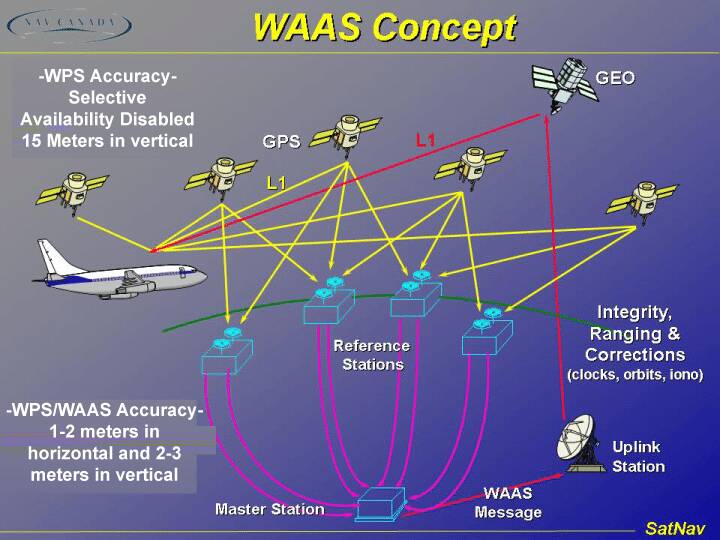 While normal GPS system are using 4 satellites, one for UTC transmission, one for altitude transmission and two for cross bearing positioning, WAAS uses an additional geo stationary facility. This “Virtual Satellite” knows exactly where it is located, regarding his coordinates on the earth. So, the calculation of your position can be done more precisely and is capable of replacing an ILS.