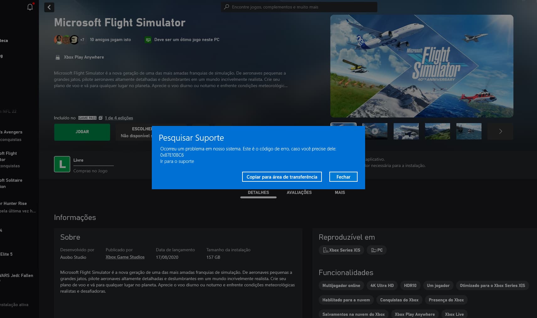 When opening the FS2020 program, the package dependency installer screen appears and then the error: “There was a problem on our system. This is the error code, in case you need it: 0x87E10BC6”