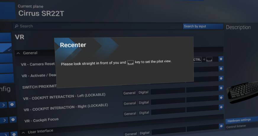 - Recenter pop-up appears, advising to press space bar to set pilot view