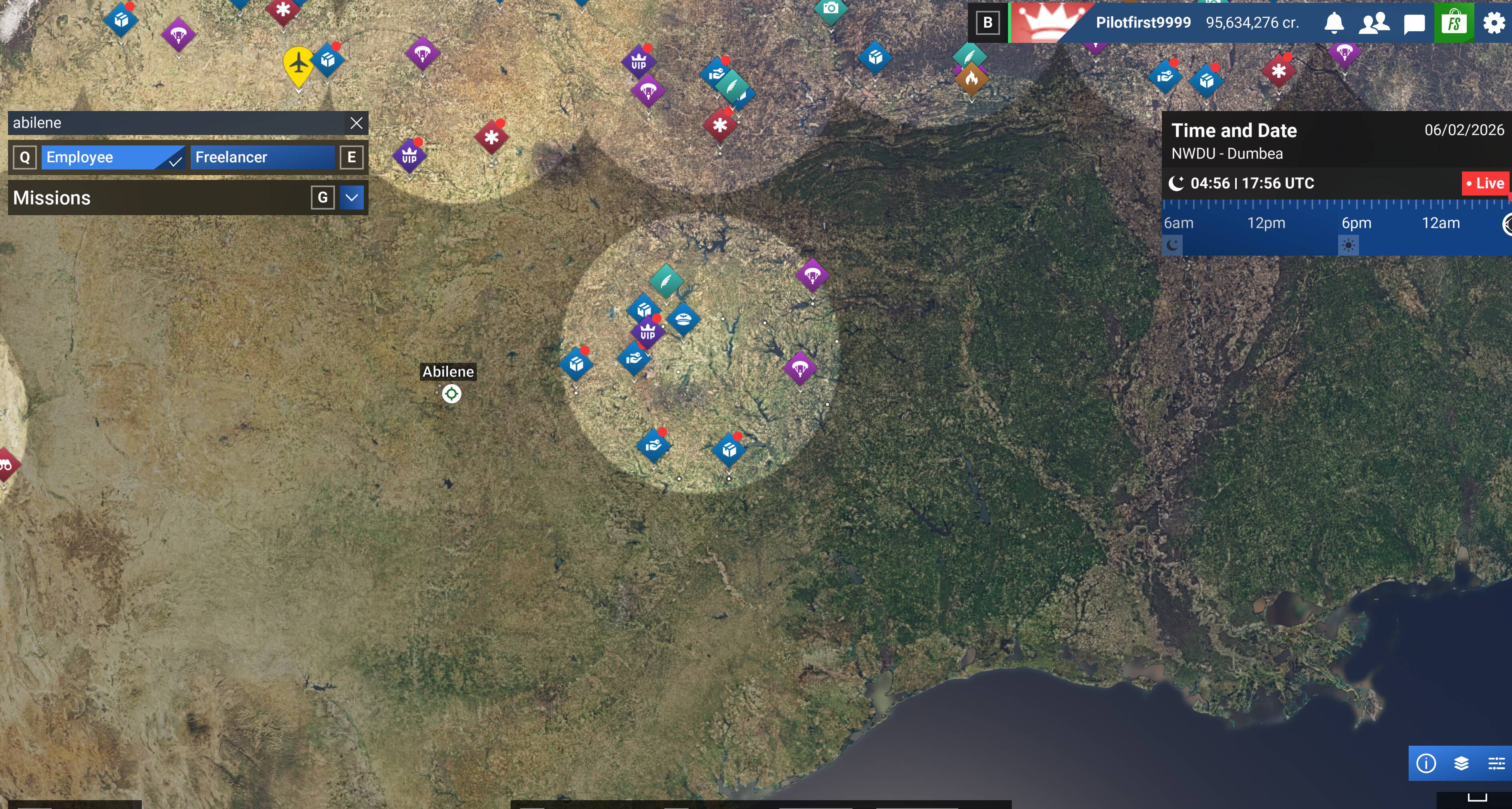 I want to place the plane near Abilene, Texas. Closest missions visible are those east of Little Rock. Hope you can see this screenshot.