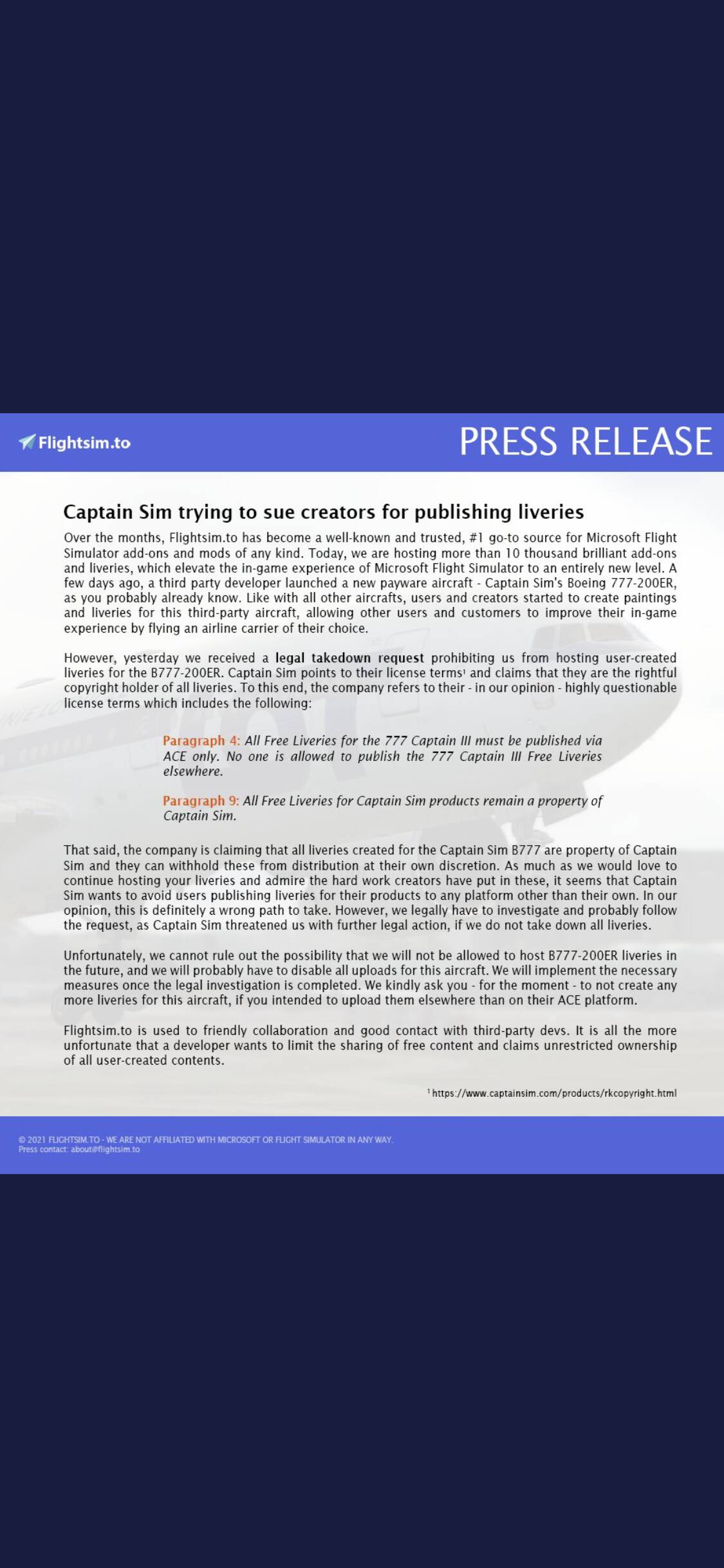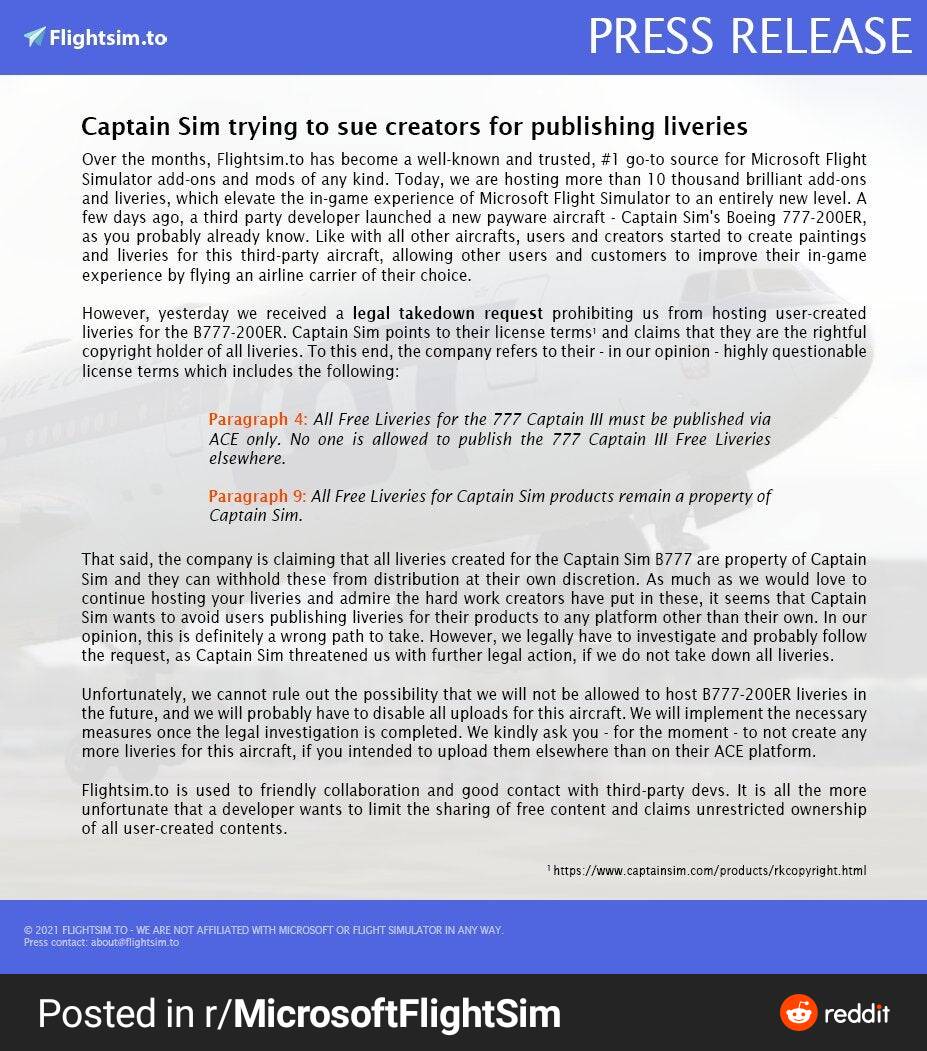 Hello! I would just like to let all the livery painters that have created custom liveries for captainsim’s ■■■■■■ 777 and uploaded them to anywhere else other than their ACE platform know, captainsim has taken down all liveries, downloaded them, and reuploaded them, without permission, to their platform.