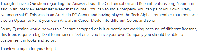Would it be possible to have a simple editor to allow to create our own livery for our own company in Career Mode ? That’s a customization that would really make this company more mine. It sad that I get to pick the name of my enterprise but I don’t get to pick what my aircraft looks like.