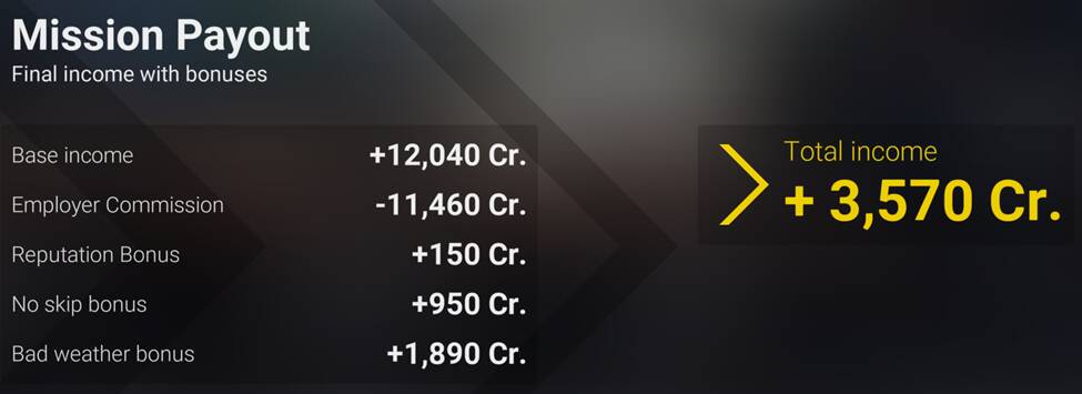 Since SU 1 career contract basic income is not payed but is reduced at the end of the mission. I thought first it was caused by using sim rate so i did a few contract/missions without using sim rate… same result. Did a passenger mission basic income 8.9 m credits, at the end it payed just 4.4 m credits. Same for VIP and medium cargo. See attachments for medium cargo mission