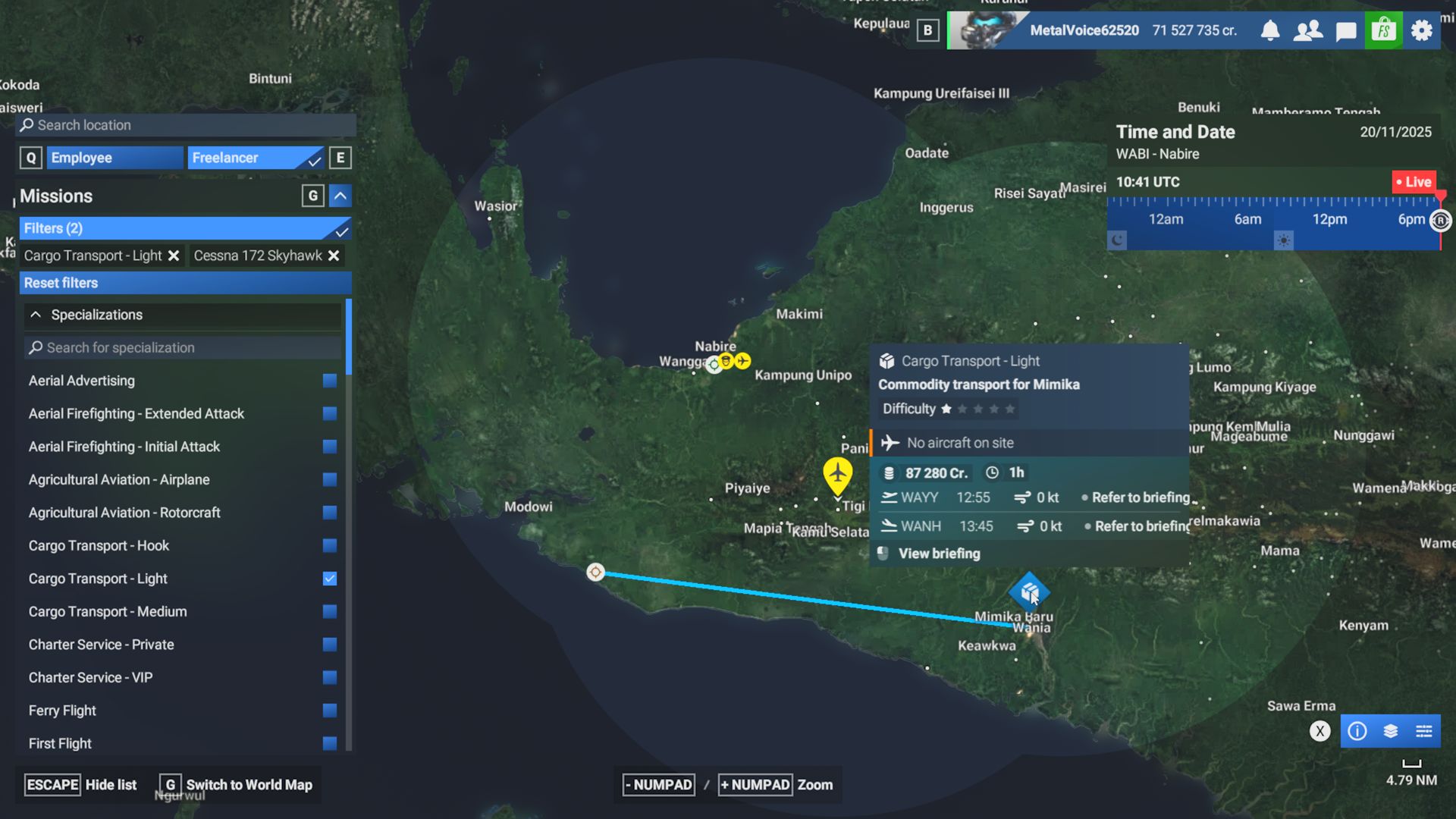 Load Missions map on Employee tab and filter Specializations: Cargo Transport - Light. Add filter Aircraft Model: Cessna 172 Skyhawk and observe missions are available