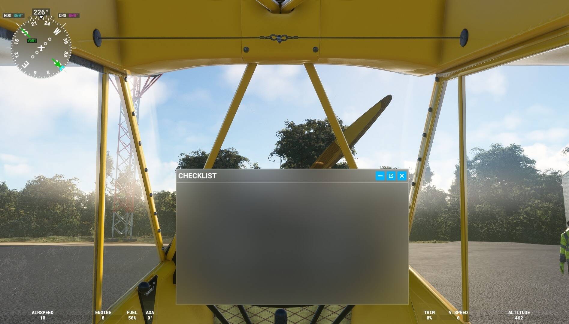 Walkaround The CAS J3 features a monolithic model, so the walkaround can take place in the cockpit view, enabling interactions. • Bolts: All in good condition and properly fastened. • Oil: check there is sufficient oil ~4.5qt • Flight controls: Check all move freely with no unusual resistance or binding. • Leading Edges/Canvas: Check for dents, tears or damage from rocks. • Tailbrace Wires: Ensure they are tight and secure. • Jackscrew: Check for excessive play or slop. • Brakes: Look for any signs of leaks. • Tires: Check for signs of cracking of excessive wear. • Exhaust Leaks: Inspect carefully for any signs of leaks. • Fluid Leaks: Check for any leaking fluids around the engine. • Propeller: Inspect for any cracks or dents.