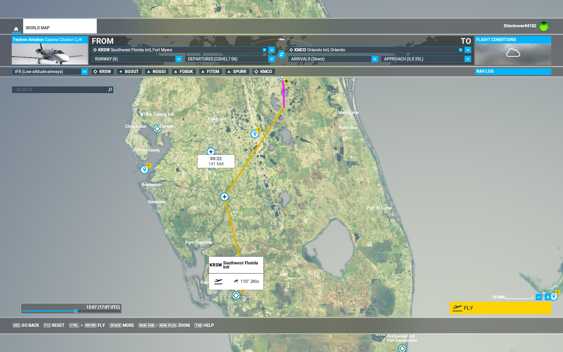 The flight plan you mention is probably a bit too simplistic for the CJ 4, which seems to like to know at least which runway you’re taking off from. I’d suggest you try the following IFR flight plan: Depart KRSW runway 06 via CSHEL7 departure, destination KMCO with RW35L approach via Vectors.