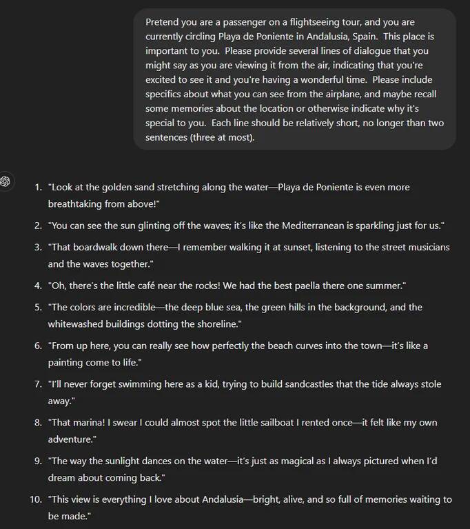 Are you sick of the same dozen or so expressions people say during flightseeing missions? As a proof of concept, I made a simple prompt for ChatGPT where the POI and city could be changed out based on the mission parameters. Here’s what it looks like: