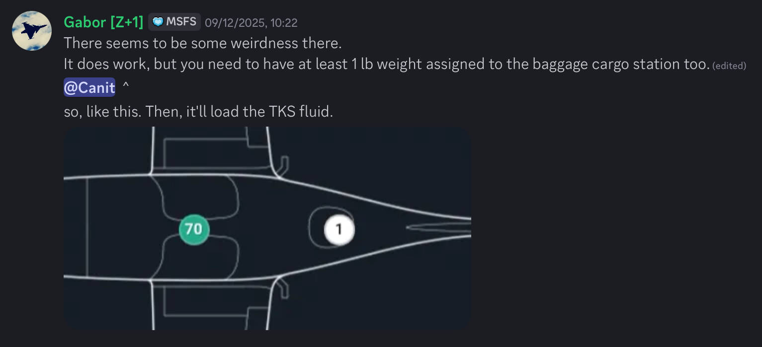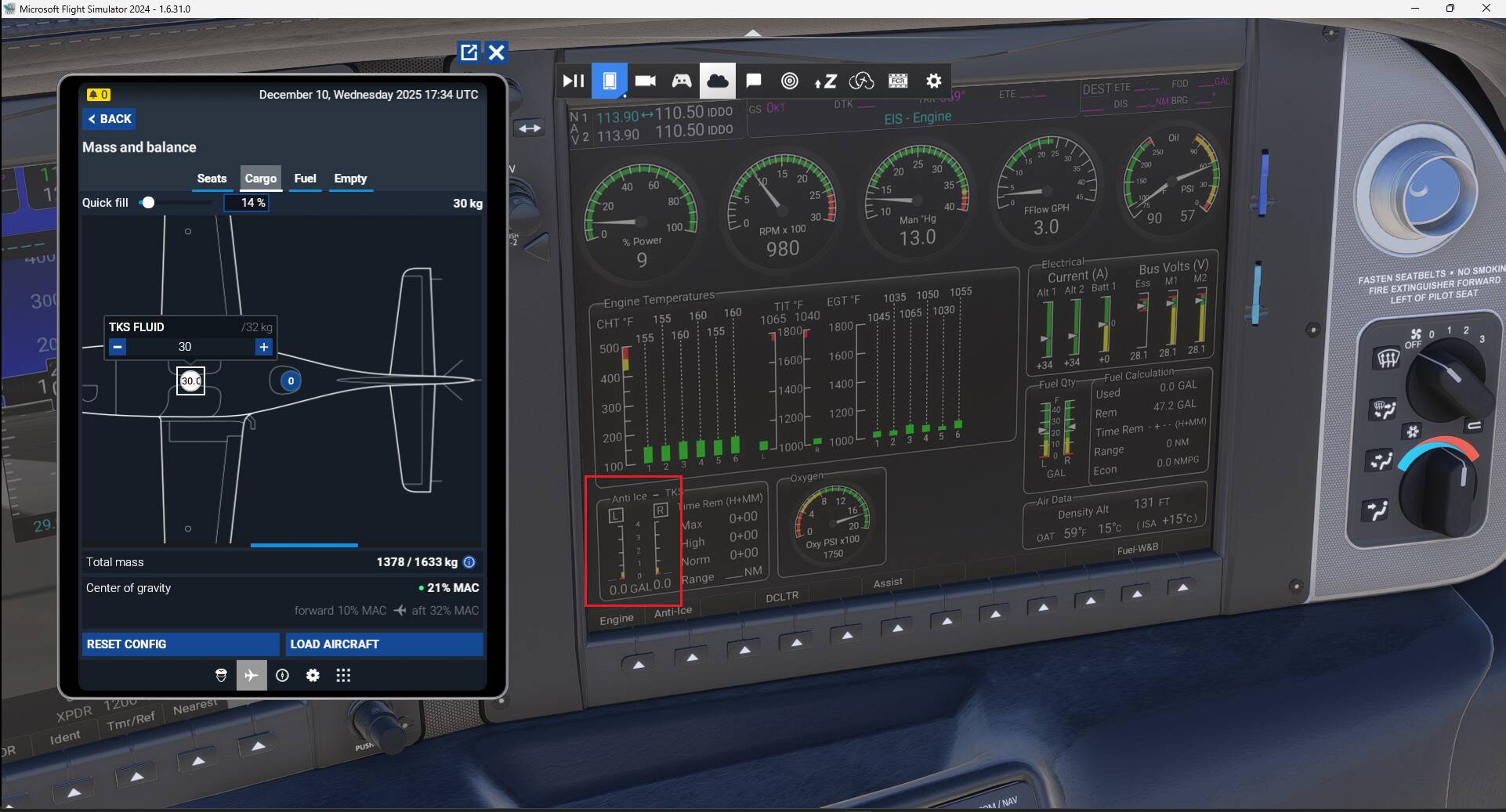 In the EFB there is a Payload and Fuel section. No Cargo Section that I see in MSFS 2024 1.6.32.0. TKS fluid is not there. Garmin continues to show empty. De-icing does not work and I crash in icing conditions.
