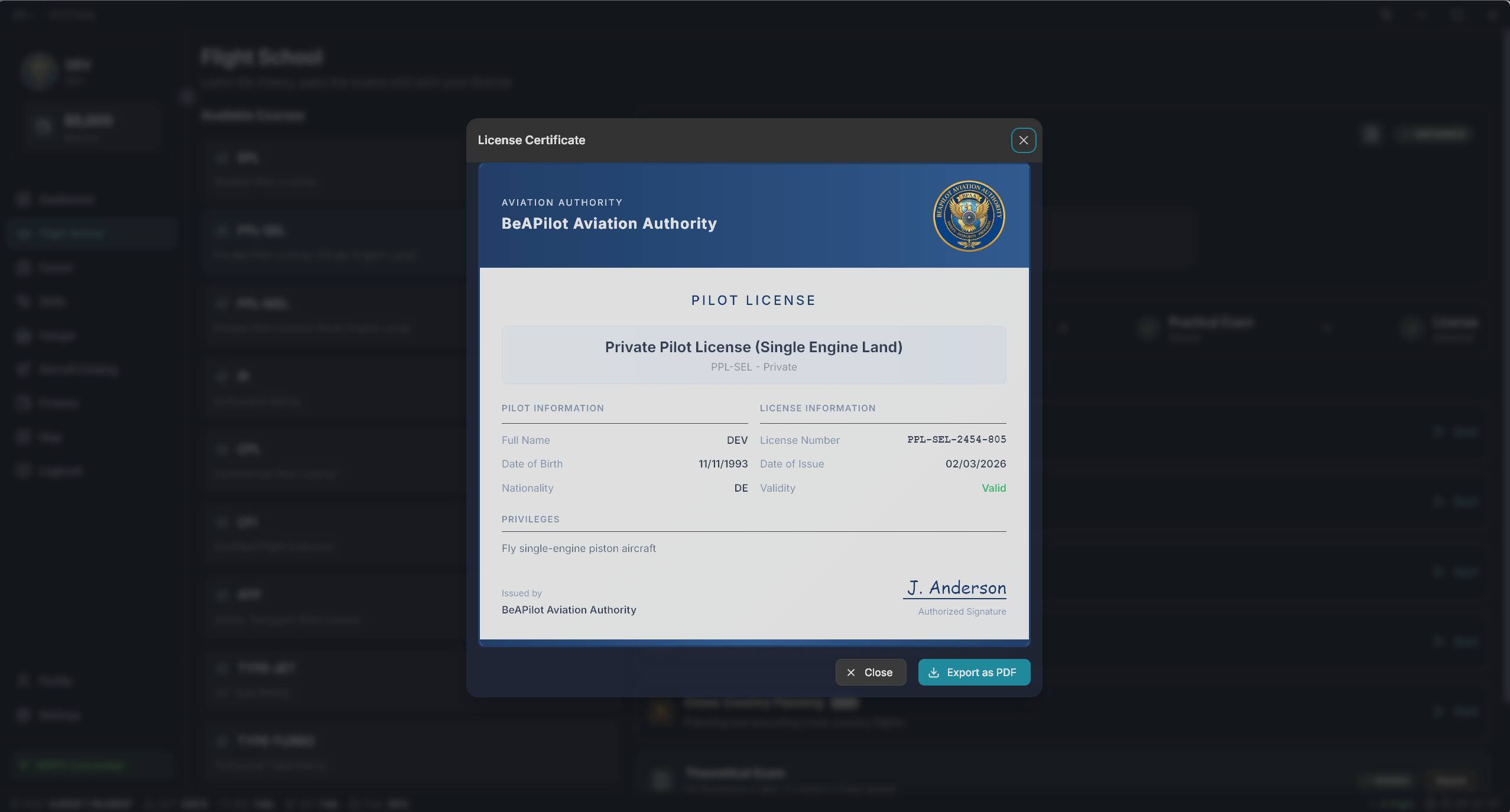 Flight School: A complete progression system. Start with zero knowledge, learn the theory, pass exams, and earn your licenses (SPL, PPL, CPL, ATP, etc.).