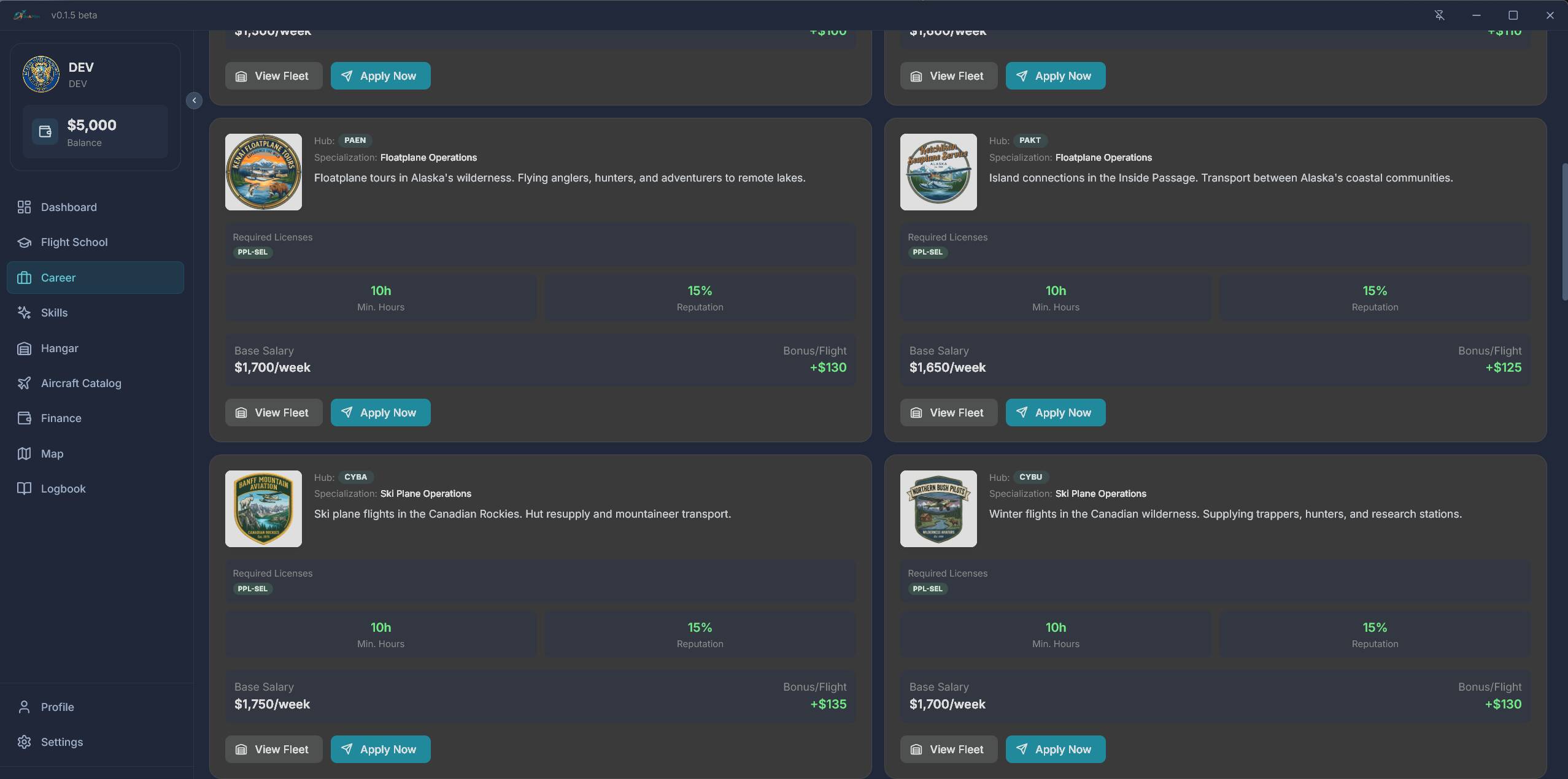 thank you for your reply. Would be awesome to have someone like you sharing his Ideas in our discord. Right now the job system is based on Employers and their fleet. Before you apply you can see the fleet. The fleet is a fix value that i set. Could be changed easily. The Location of those Employers is based on your starting Hub. The first ones are pretty close, the bigger ones get more far until the biggest ones they are always at Continental Major Airports. There is a List I made for them so it could be easily adjusted too. But indeed if there is interest my plan was to include special Employers where i could set wishes like yours. So only missions in Alaska/Canada, only those airplanes etc. be updated and see if its coming