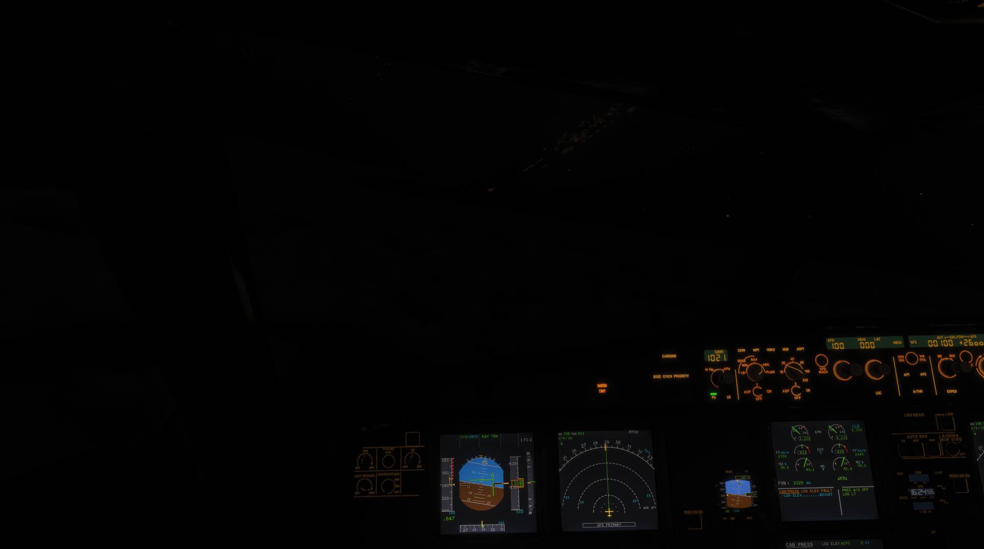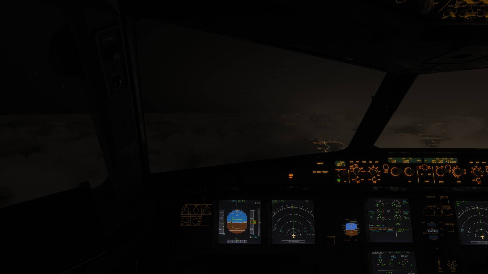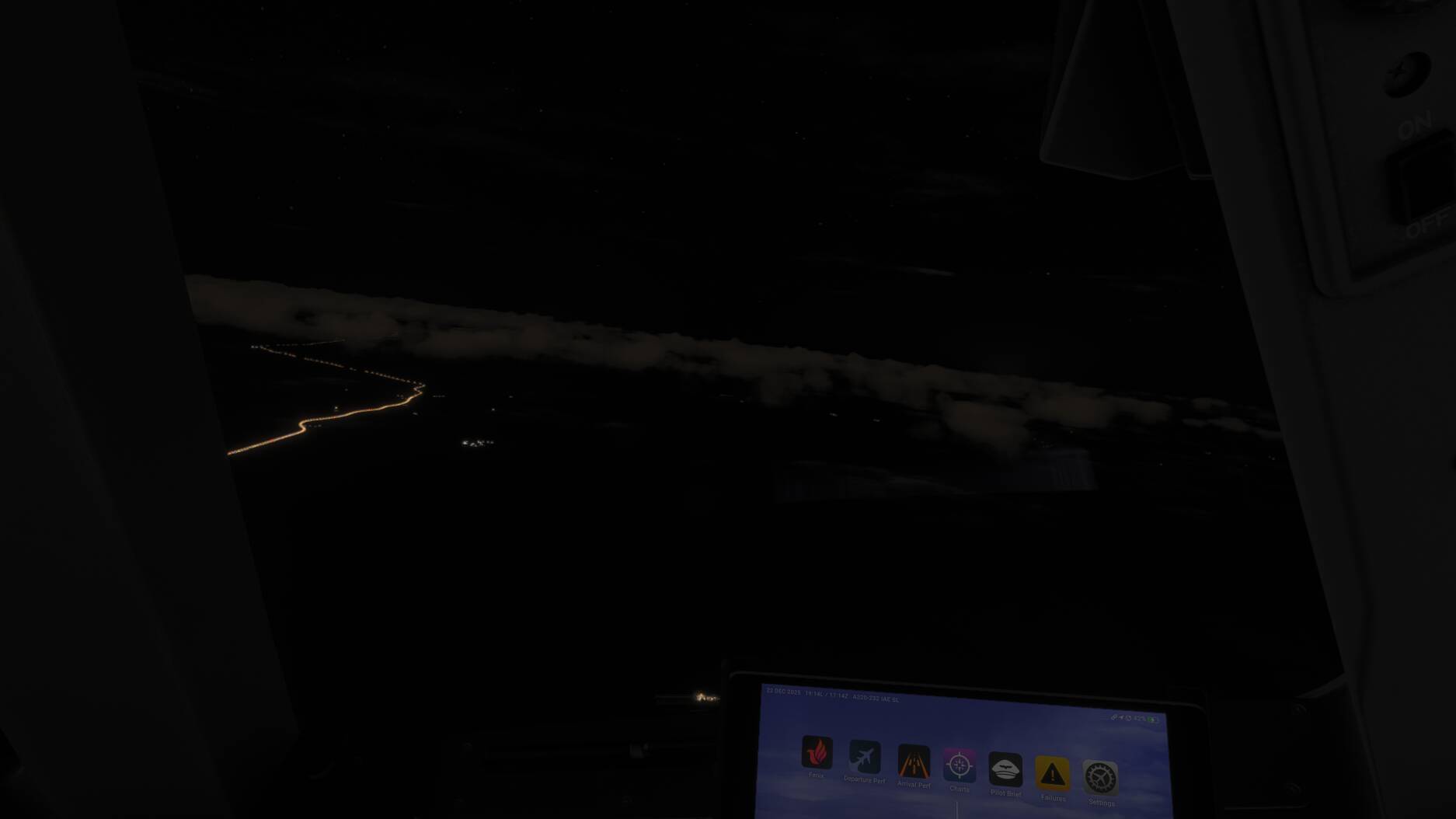 Roi741752, you are above the clouds, and if you flew in real time, there is moonlight at this moment. Not a lot, I’ll give you that. But having spent a serious amount on flightdecks I can tell you that the clouds in the image you uploaded might be a little bit too bright, but still very acceptable.