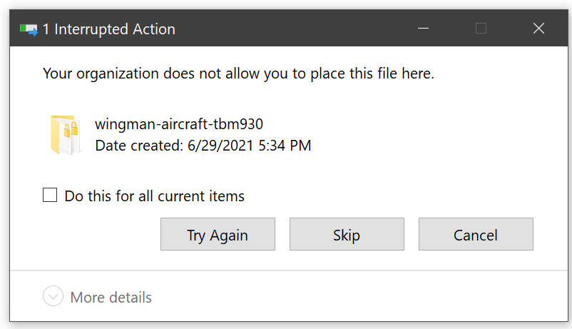 When I try to back up my community folder to a folder I’ve created in my documents, I get the attached error. I have MSFS 2020 on a SSD drive. Anyone have a solution to get by this problem? Thanks