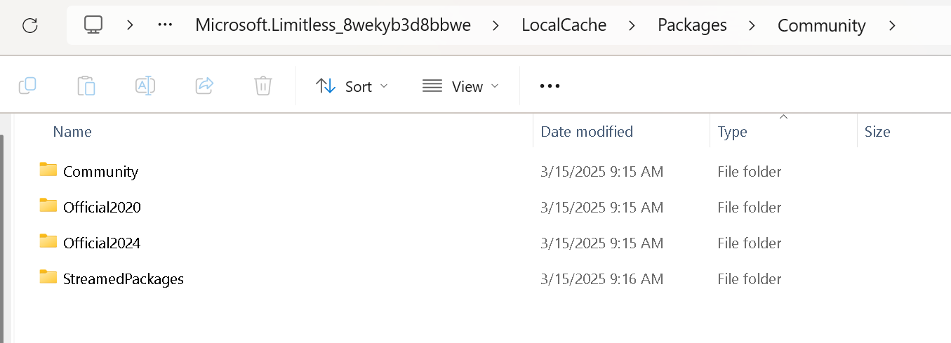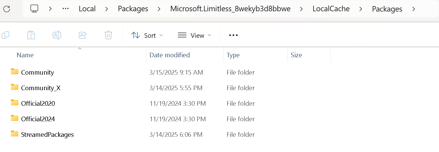 “C:\Users\your user name\AppData\Local\Packages\Microsoft.Limitless_8wekyb3d8bbwe\LocalCache\Packages\Community”