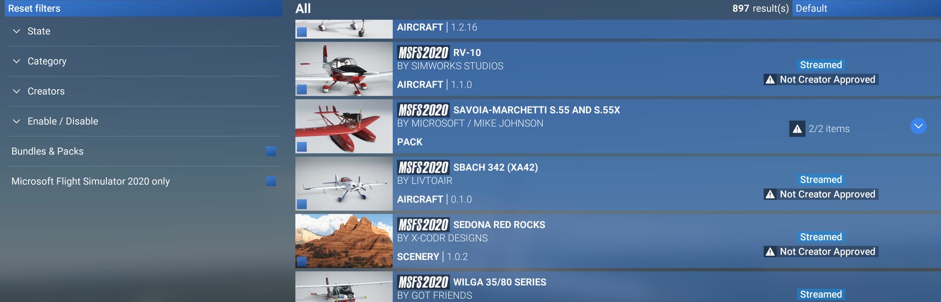 Yes all my original content is in the Community folder. But after checking the settings as you suggested, and hitting the Confirm button offered in that screen, after restart, now “My Library” does not show any of the “MSFS2020 Community Disabled” at all. All those items I pictured earlier have disapeared. Now it is just the MS/Market Place files. I do not have the Community listed on the left side as you do. See pic below. Also I wonder what the “Not Creator Approved” means showing on some of those aircraft that do appear. I love this game when it is working, but it seems rediculous for such a world player like MS to have released such an ill prepared product as this.