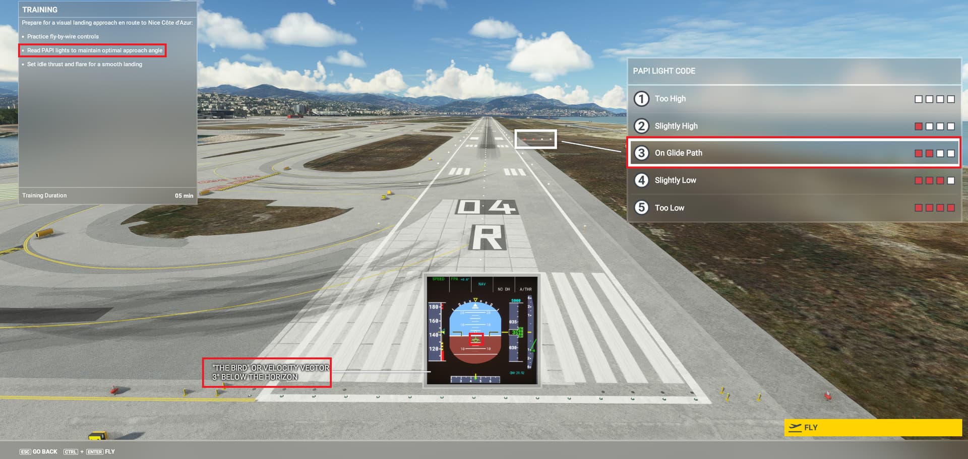 i totally agree there are next to zero tutorials on how to fly airliners at all & the couple there are do not give you any proper info, i have absolutely no idea what it is im meant to be looking at ? i dont see a 3 anywhere & so i dont understand what 3 degrees is ? also it is not linerd up with the runway at all & if you shift the plane to line up then it goes off green in the objective which suggests that it is off but if you keep the objective box green then you dont even land on the runway instead way off to the right of it. im sure this is all very easy to people who know what they are doing already but it isnt user friendly for beginners.