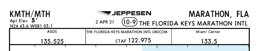 Airport was KMTH. No tower (I don’t believe) and has ASOS. Uses Miami Center, I’d have to go look back in com logs but I think I was throwing in “Tower” when I should have been saying Center in the previous posts.