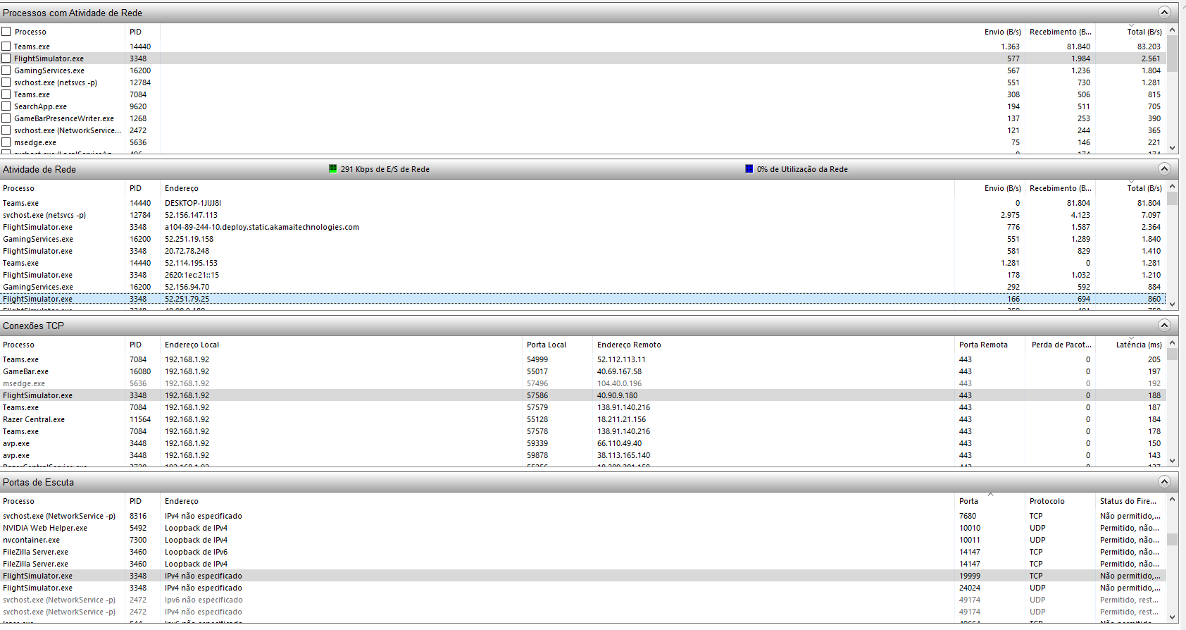 Thank you very much for your ideia, after uninstalling the Radmin VPN two connections of Flight Simulator desappeared from Network Activity tab, I will attach the screenshot of resource monitor now.