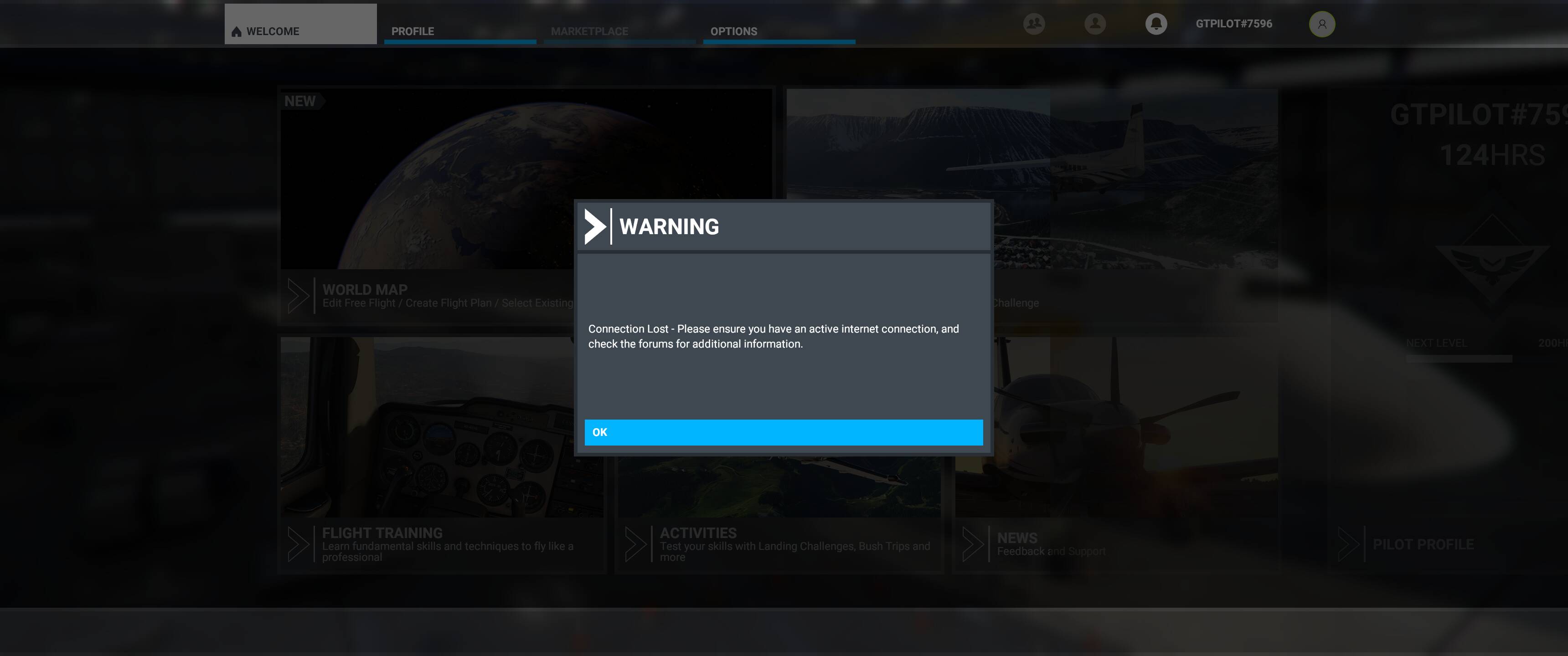 After some days this banner is appearing more and more after the update 5, I’m unable to access the marketplace and use live weather. Several times that I’m on critical parts of the flight this thing appears on the screen. My internet is good and I don’t lost packages any time, seems to be a problem with the connection to the flight simulator servers. The thing is that I’ve never had this issue since the release date of the sim, it started happening about one moth ago. I use the same internet since more than 3 years.