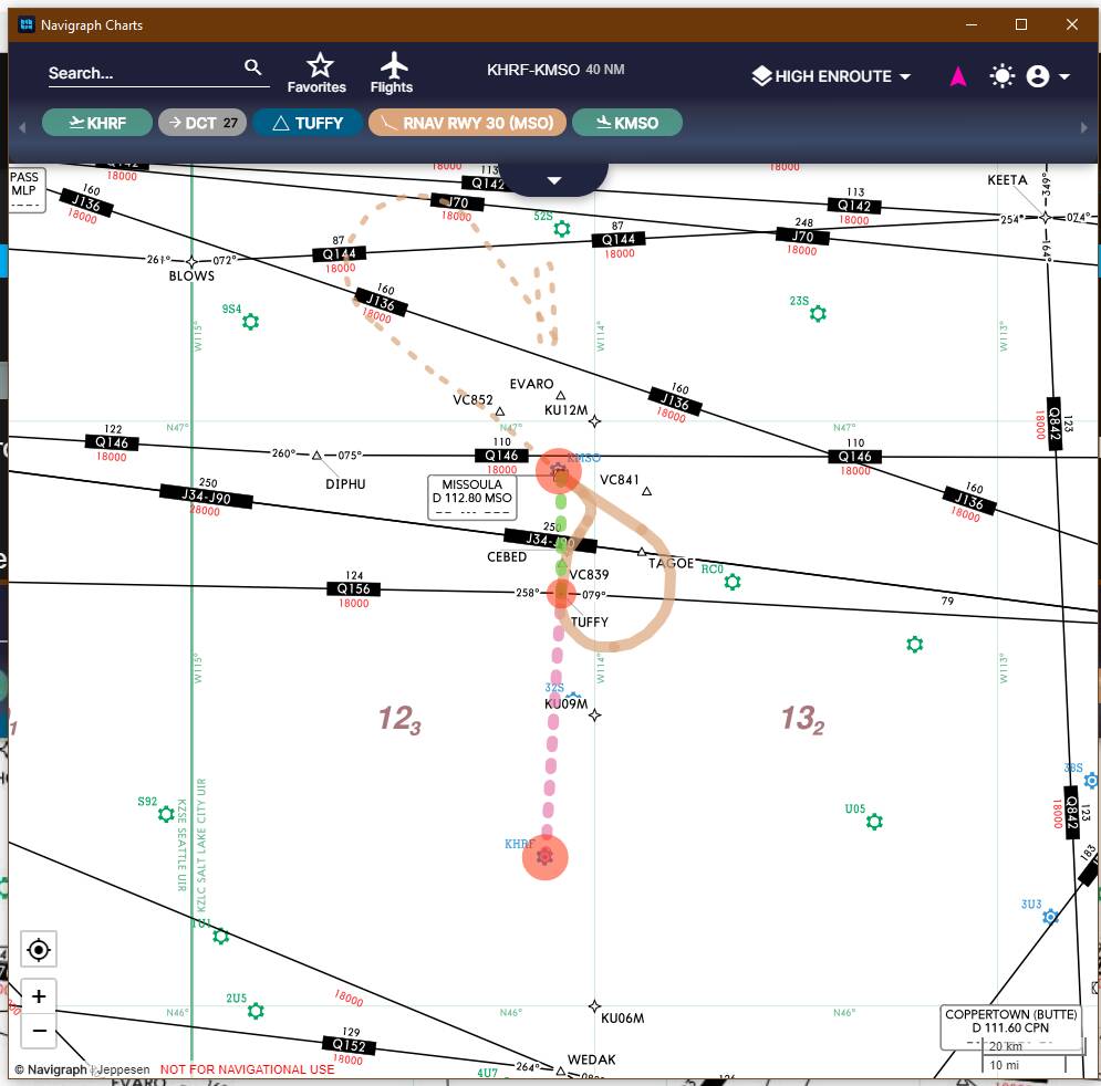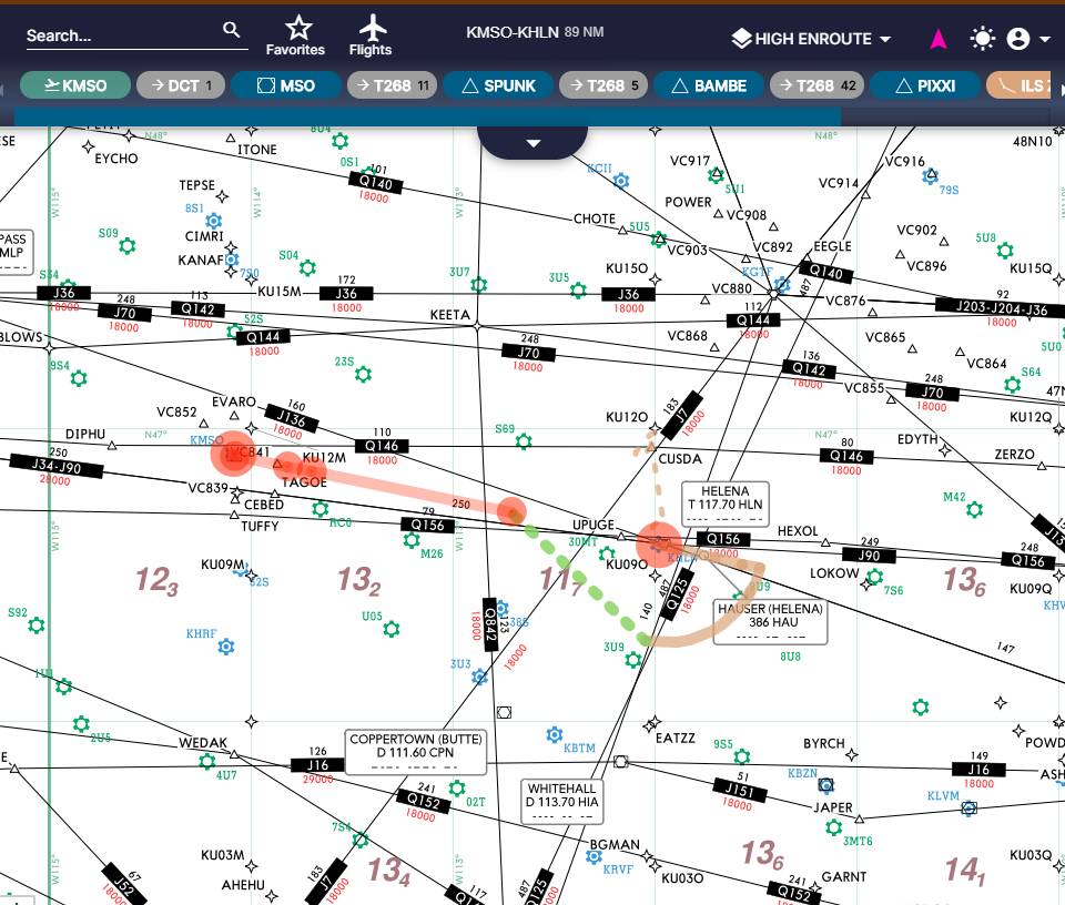 After landing and parking, called for gas, then deleted the flight plan, and put in another segment from Missoula to Helena. Same deal. Used navigraph charts to plan, input into the garmin, then requested IFR clearance.
