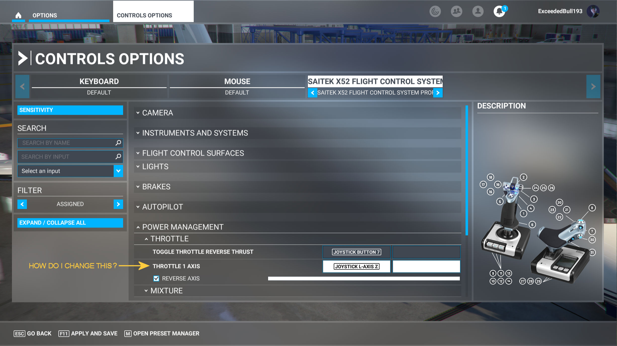 My Saitek X52 has only ONE throttle control. When inside a 2 engine jet, the throttle only controls 1 engine, I have to use the mouse pointer to control the other engine equal to the first engine. A real pain. I have looked all over the place in the control menu but just can not find this Axis setting, where is it? It is probably set for ‘Axis 1’ or ‘Axis 2’. It needs to change to just ‘Axis’. Thanks