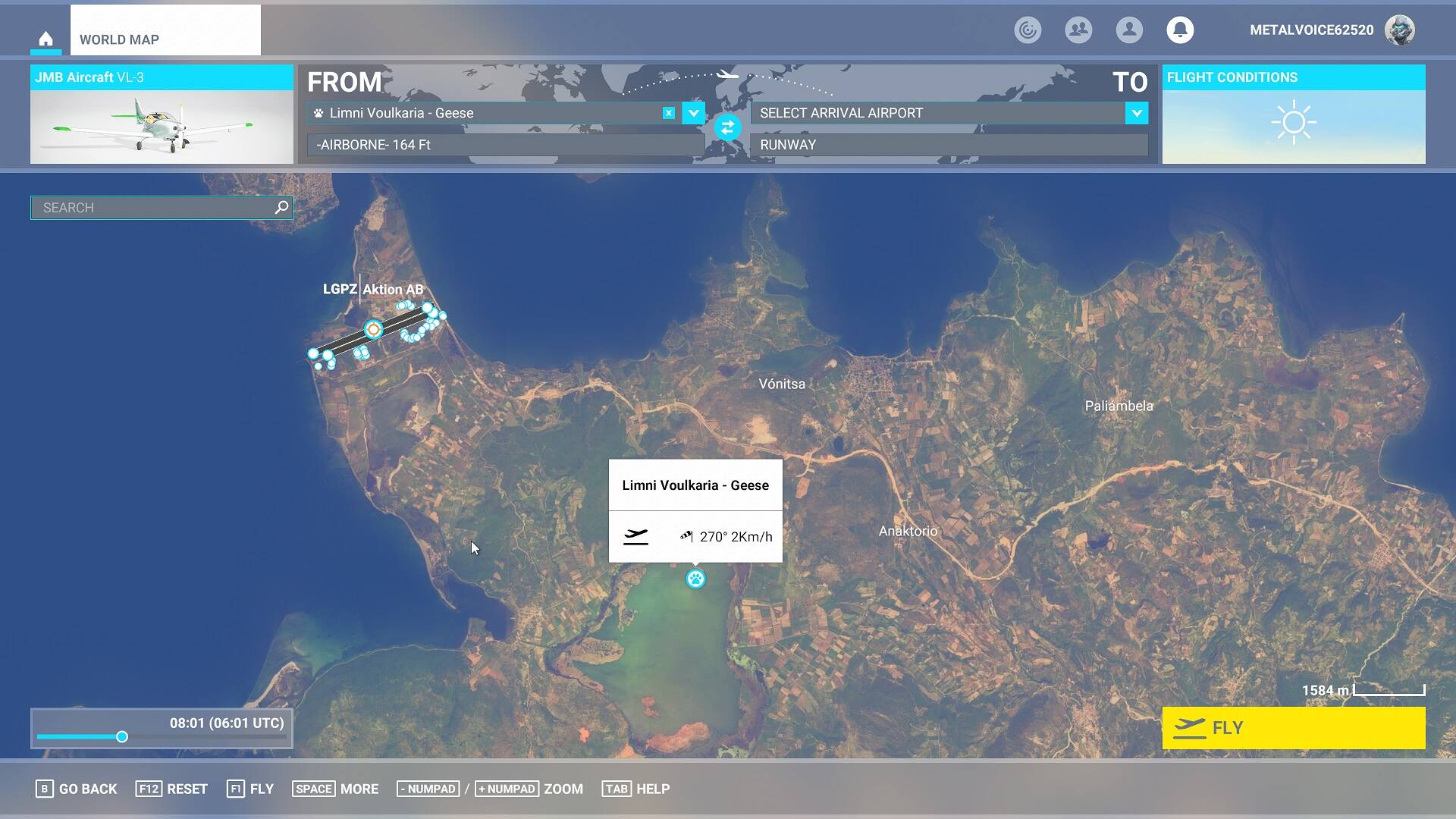 Try: start a simple flight to observe geese at lake Volkaria, near LGPZ airbase in Greece.