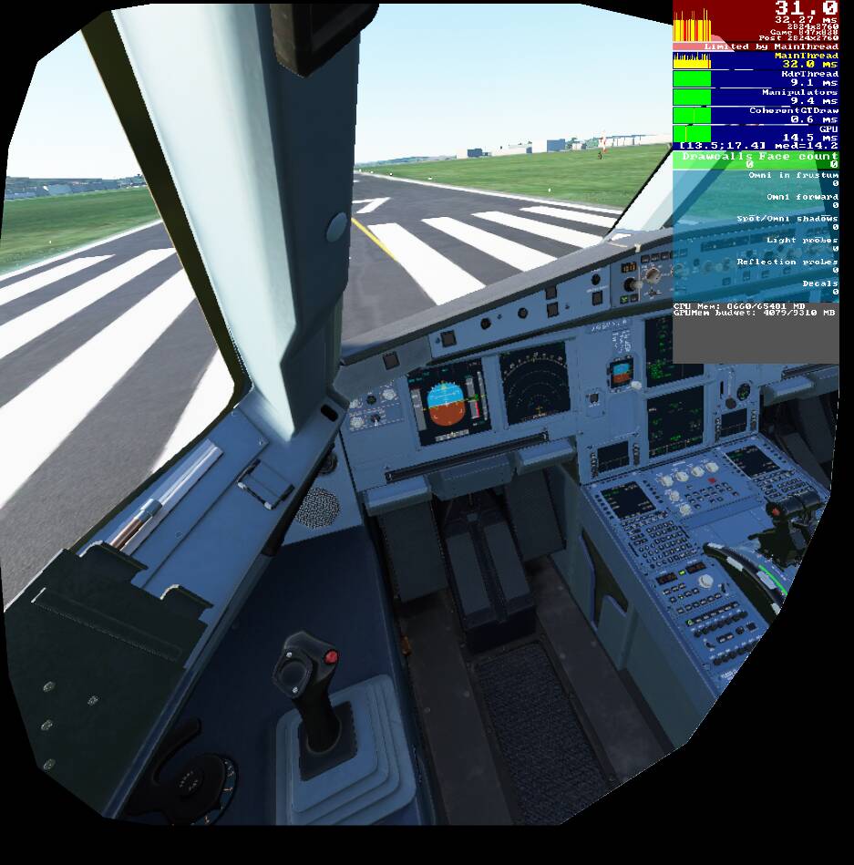 I’m stuck at that ~30 FPS CPU (main thread) limit at every VR graphic setting set to low or off, render scale only 30% which is 847x828 pixel (in every standard airliner). The load on the GPU is almost 0… but I can’t put any other setting higher because that will also increase CPU load.