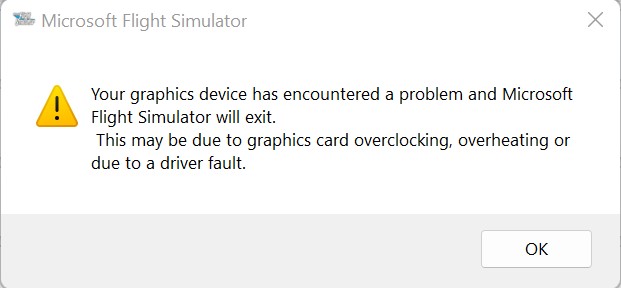 I found a way to trigger that on demand. When MSFS is launching, upgrade your GPU drivers. Yeah, it doesn’t like it when the GPU disappears from under it. ![]()